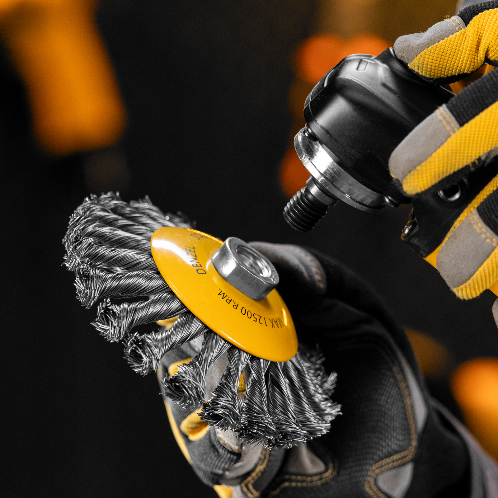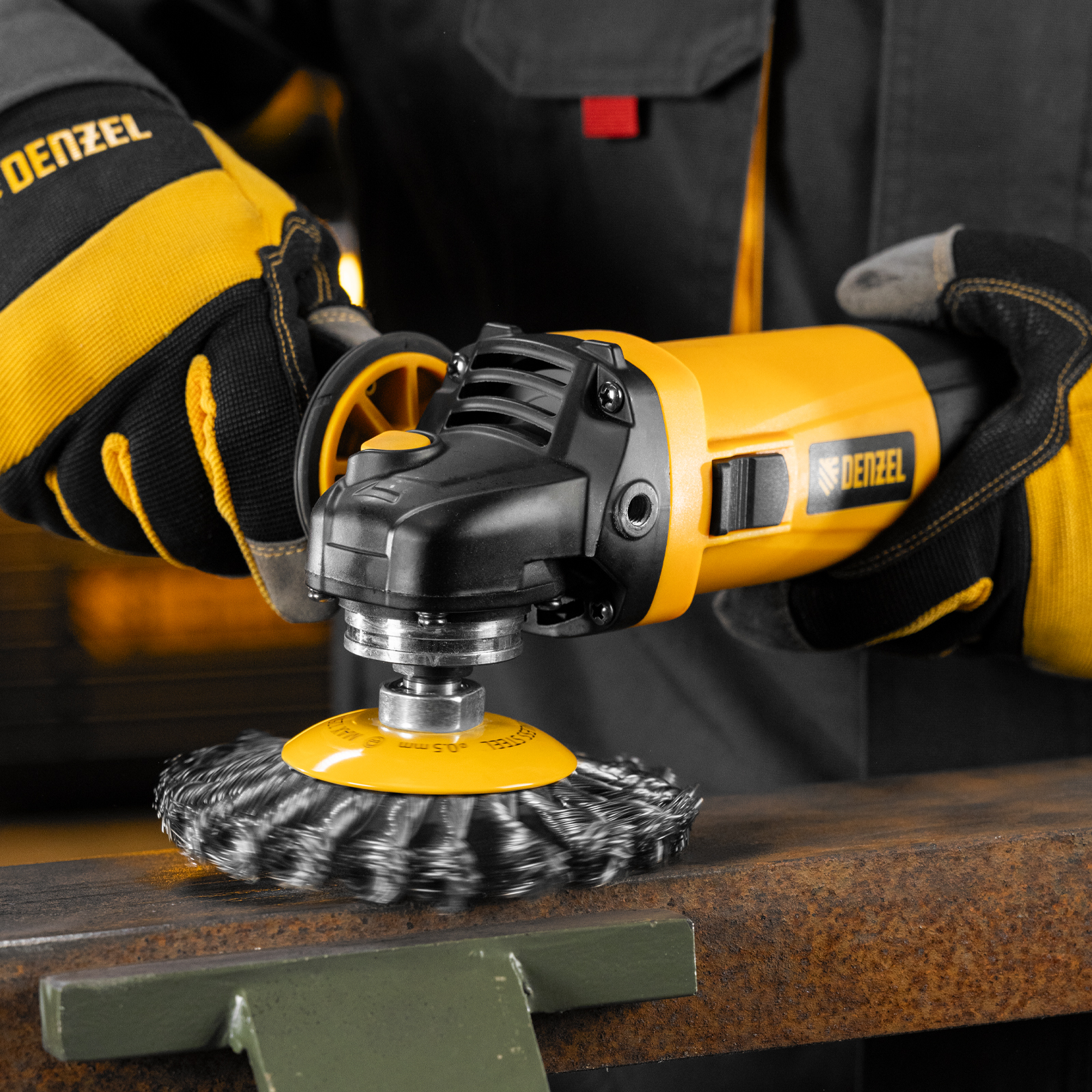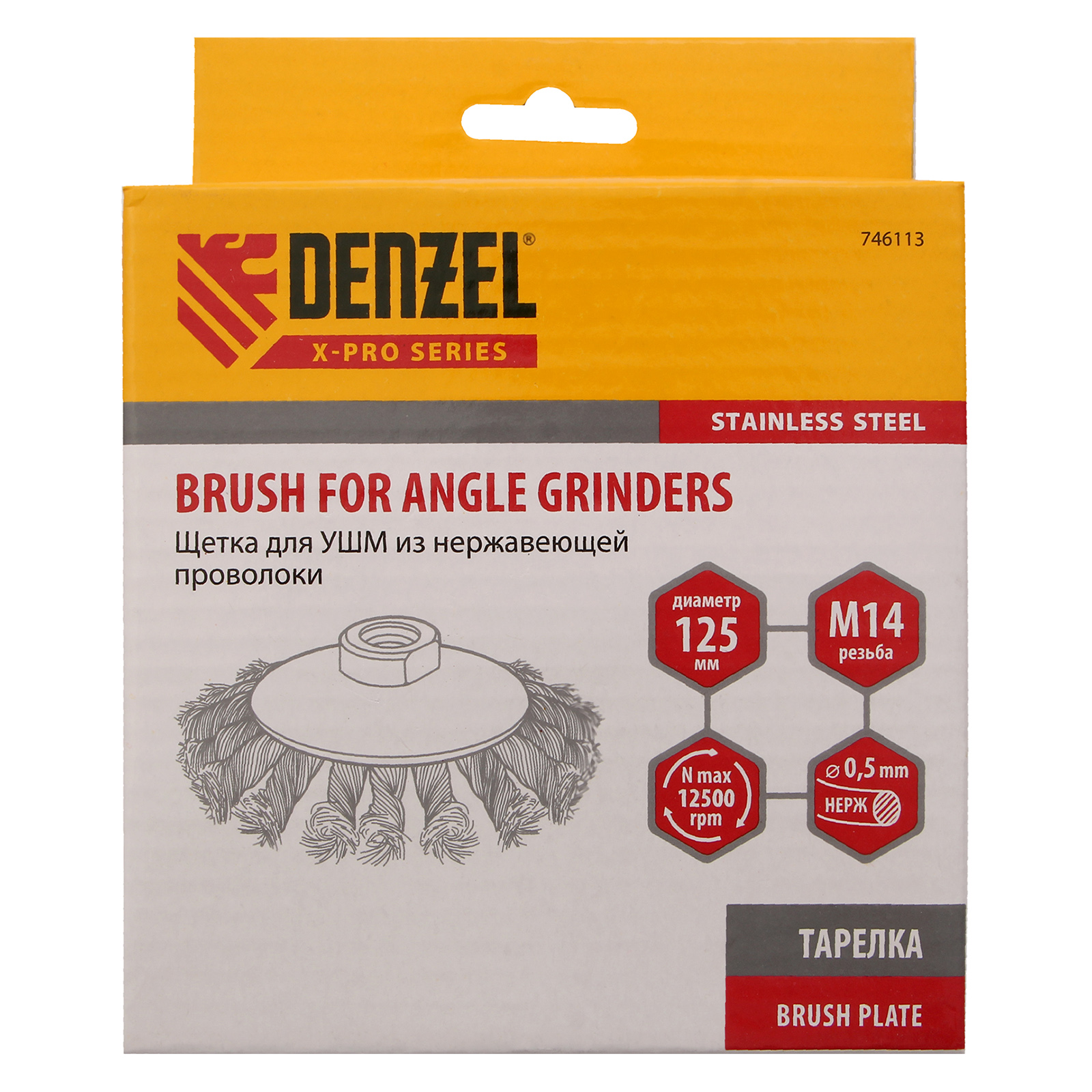 Щетка для УШМ Denzel «Тарелка» 746113, 125 мм, М14, с щетиной из крученой нержавеющей проволоки 0,5 мм, предназначена для снятия толстого слоя краски, лака, ржавчины, для удаления заусенцев и окалины, зачистки сварных швов. Щеткой обрабатывают твердые, преимущественно металлические поверхности, в том числе из нержавеющей стали. Она удобна для очистки как плоских изделий, так и внутренних углов, пазов, изгибов. Щетка совместима с углошлифовальными машинами, поддерживающими работу на скорости до 12500 об/мин. Во время работы необходимо использовать средства индивидуальной защиты. Щетка пригодится во время строительства, на производстве, а также будет полезна в быту.