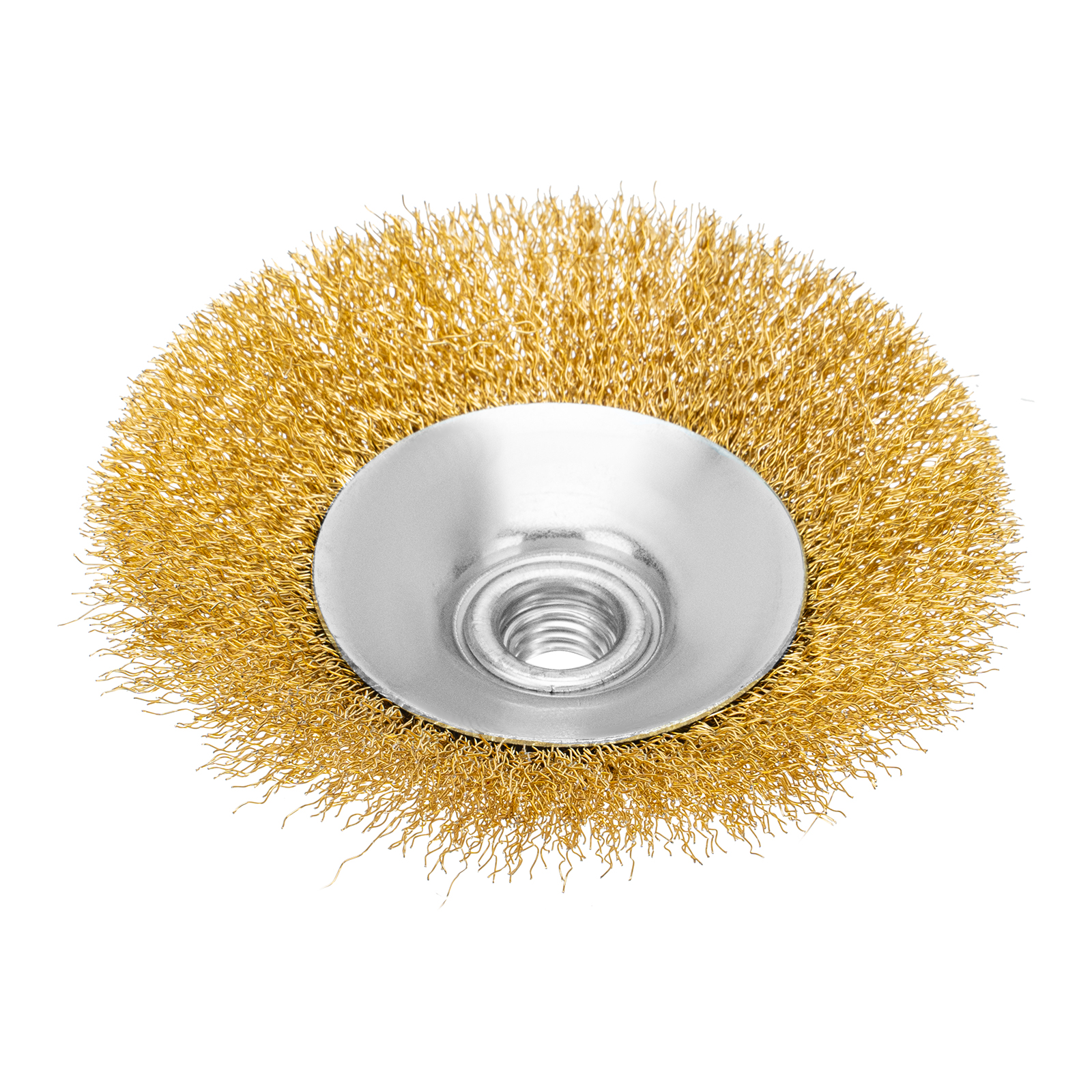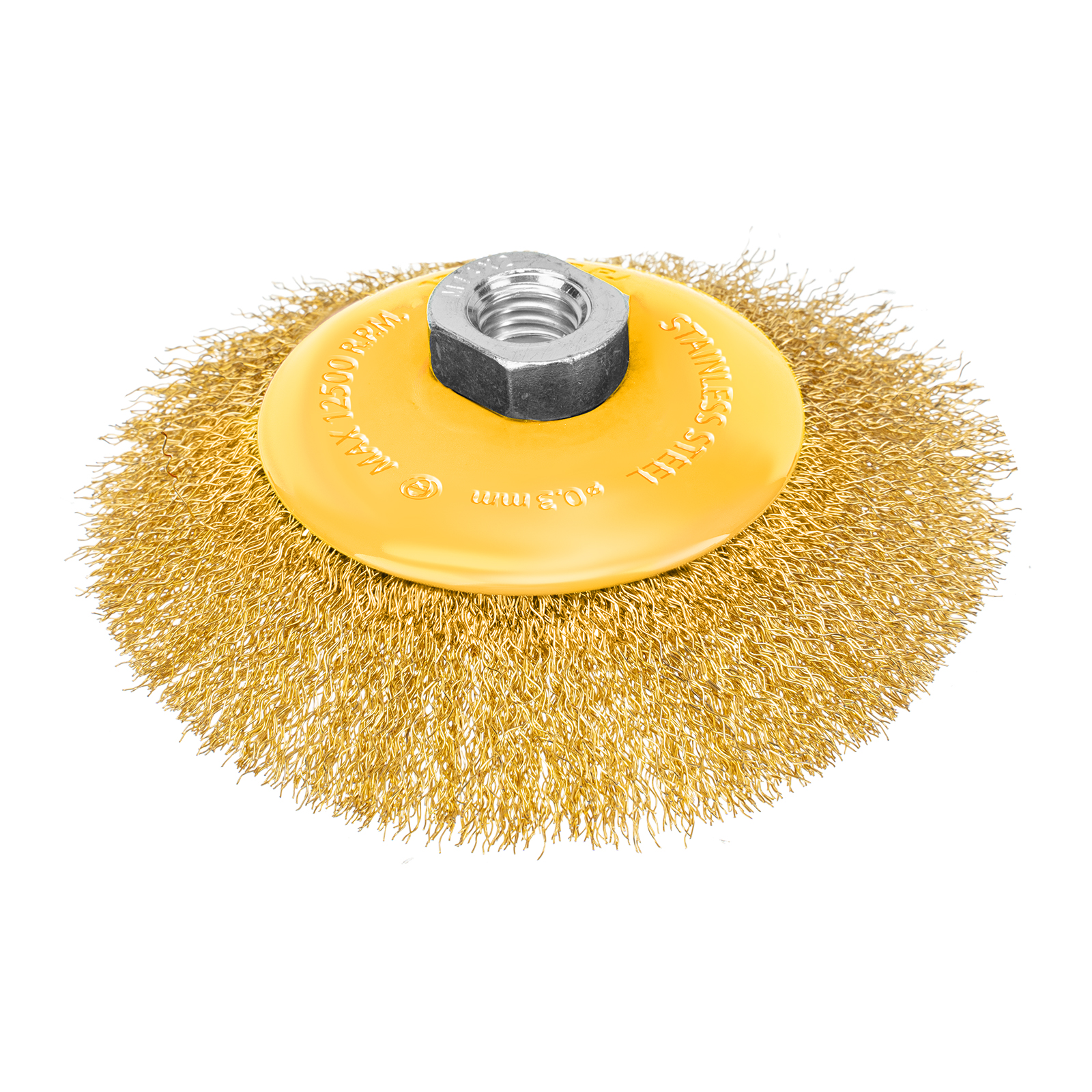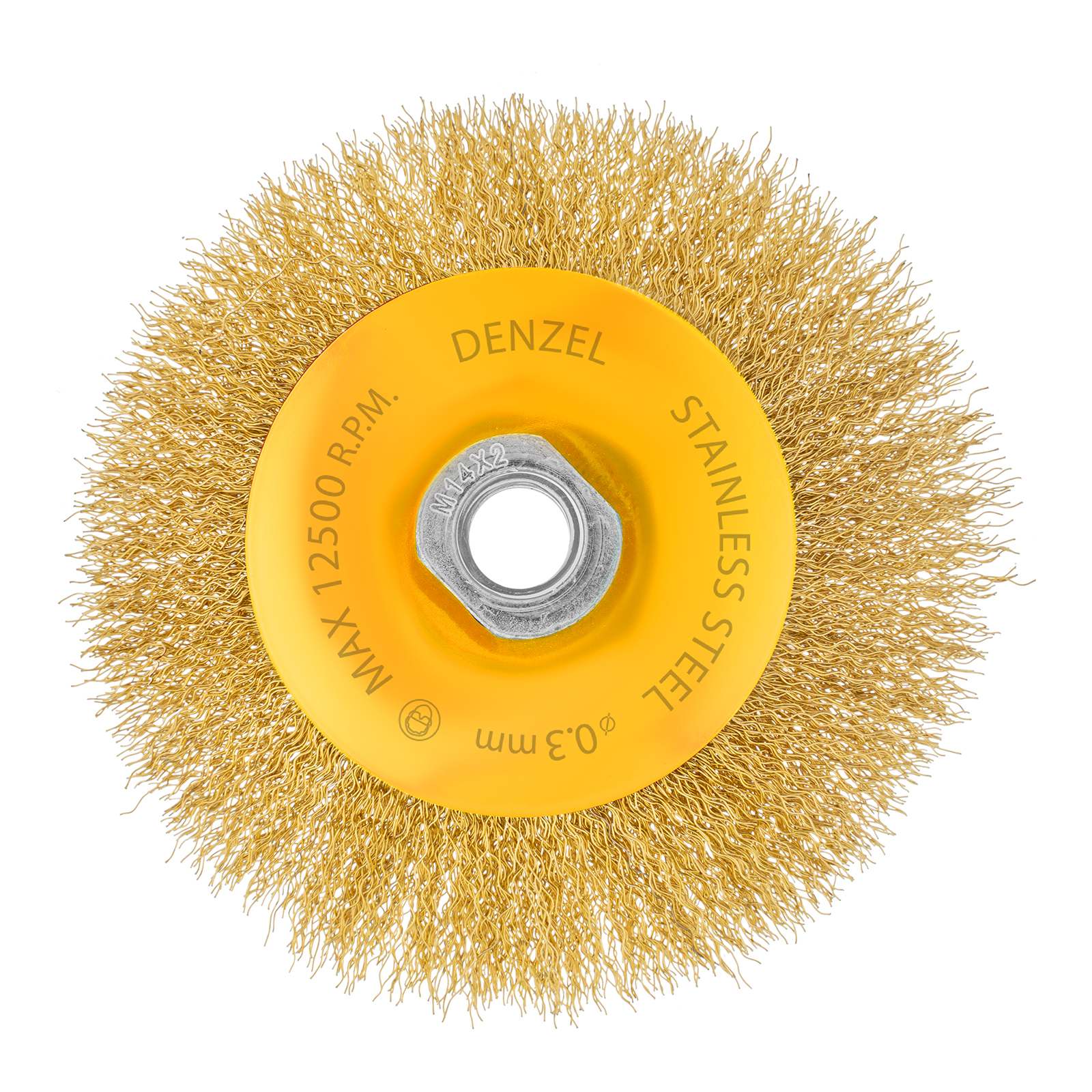 Щетка для УШМ «Тарелка» Denzel 746163, М14, диаметром 125 мм, с щетиной из витой нержавеющей проволоки 0,3 мм, используется для щадящей обработки металлических, в том числе нержавеющих, а также деревянных и пластиковых поверхностей. Постепенно снимает тонкий слой ржавчины, старого лака или краски, удаляет загрязнения. Подходит для придания поверхности заданной шероховатости или подчеркивания структуры дерева. Тарельчатая форма щетки оптимальна для обработки как плоскостей, так и труднодоступных мест. Щетку устанавливают на вал углошлифовальной машины (УШМ), поддерживающей работу со скоростью до 12500 об/мин. Обязательно использование защитных очков, респиратора, перчаток, наушников, спецодежды и обуви. Щетка предназначена для выполнения профессиональных и бытовых работ.
