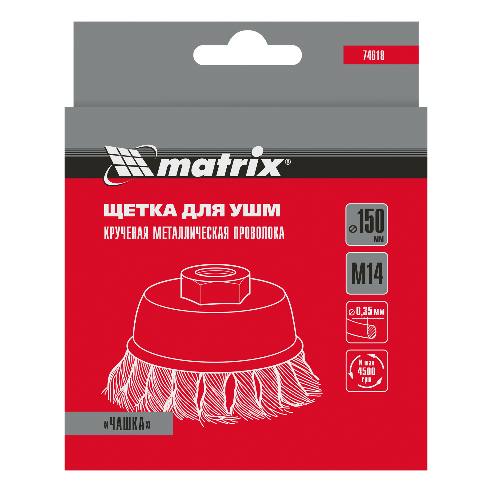 Щетка Matrix «Чашка» 74618 диаметром 150 мм, с присоединительной резьбой М14, с щетиной из крученой проволоки диаметром 0,35 мм, устанавливается на УШМ, поддерживающую работу со скоростью 4500 об/мин. Щетина предназначена для грубой (черновой) обработки поверхностей, менее агрессивной по сравнению с щетиной 0,5 мм. Изделие подходит для удаления загрязнений, снятия толстого слоя ржавчины, ЛКМ, зачистки сварных швов.
