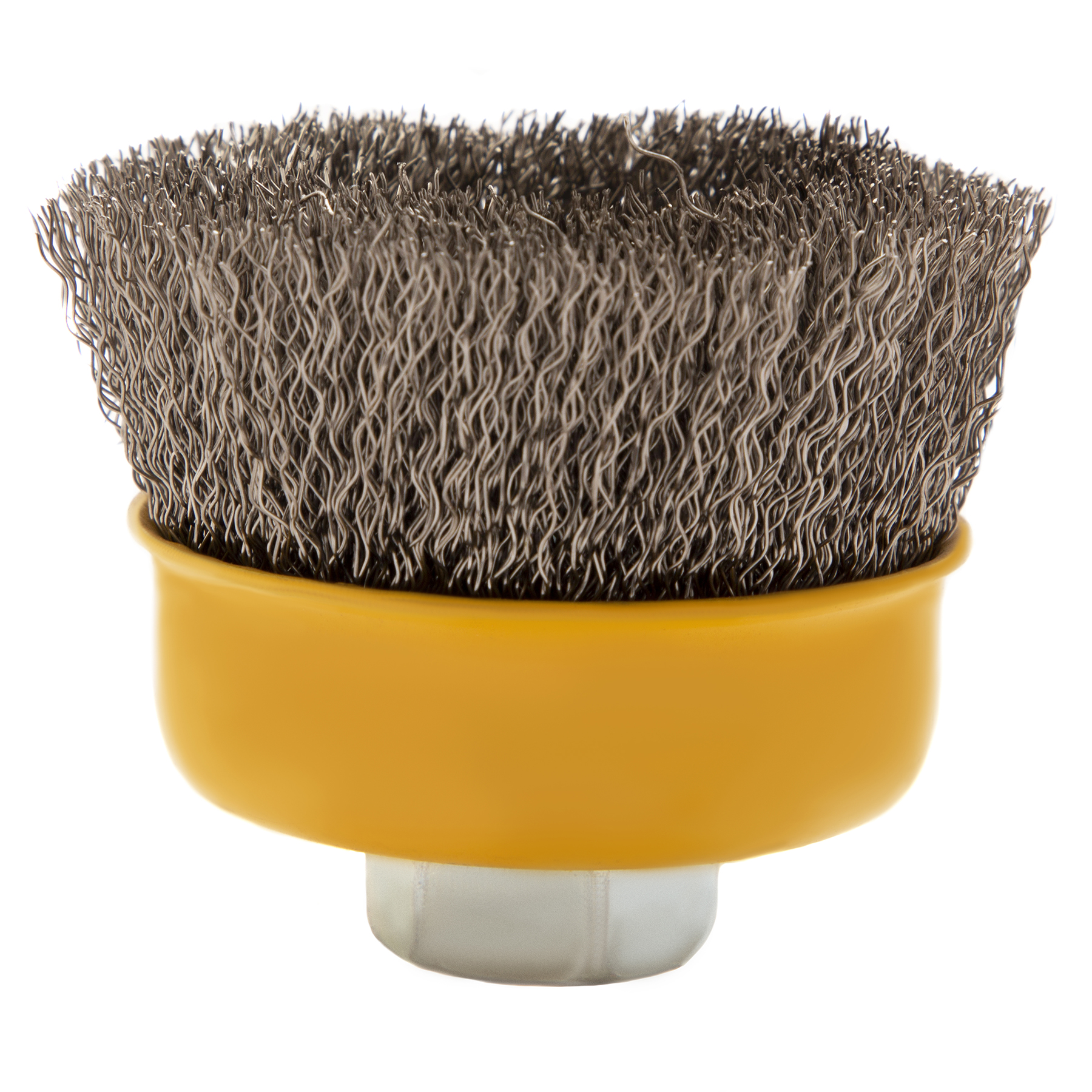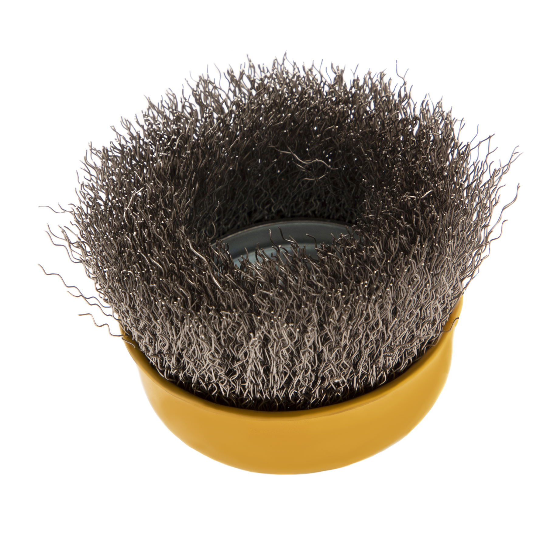 Щетка для УШМ «Чашка» Denzel 746043 с гайкой М14, диаметром 75 мм, с щетиной из витой нержавеющей проволоки диаметром 0,3 мм, позволяет быстро и аккуратно очистить металлическую, деревянную или пластиковую поверхность от незначительных загрязнений и ржавчины, а также удалить остатки лакокрасочных материалов, сделать поверхность шероховатой или матовой. Насадка предназначена для очистки плоских участков большой площади. Подходит для обработки нержавеющей стали.