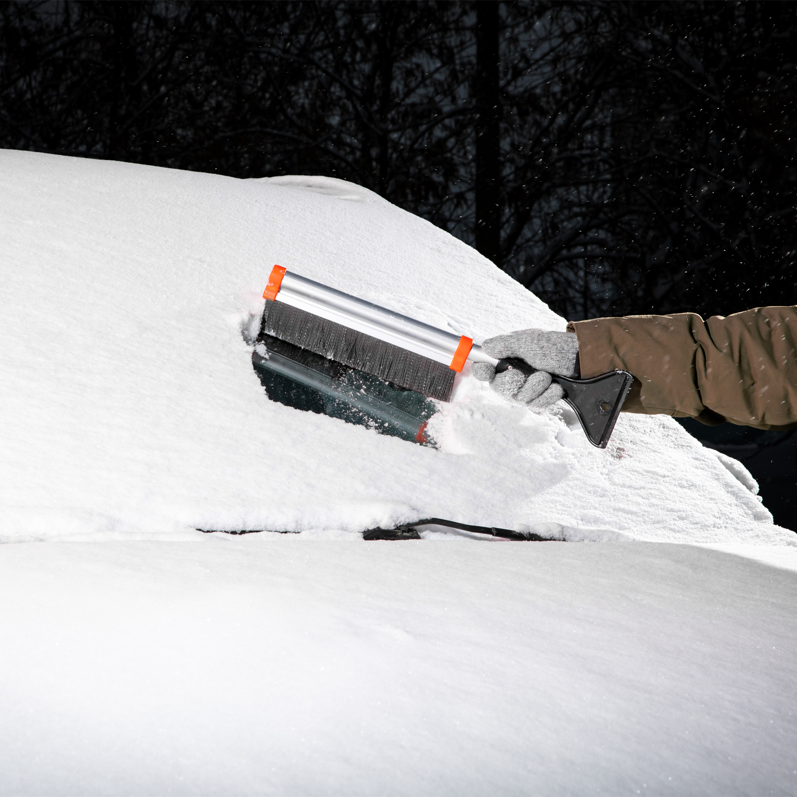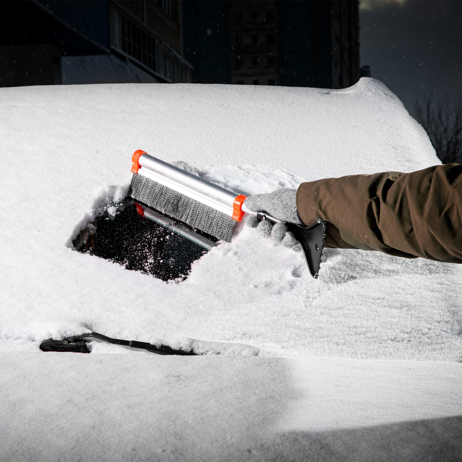 - Щетка-скребок с густой щетиной легко справляется с толстым слоем снега.