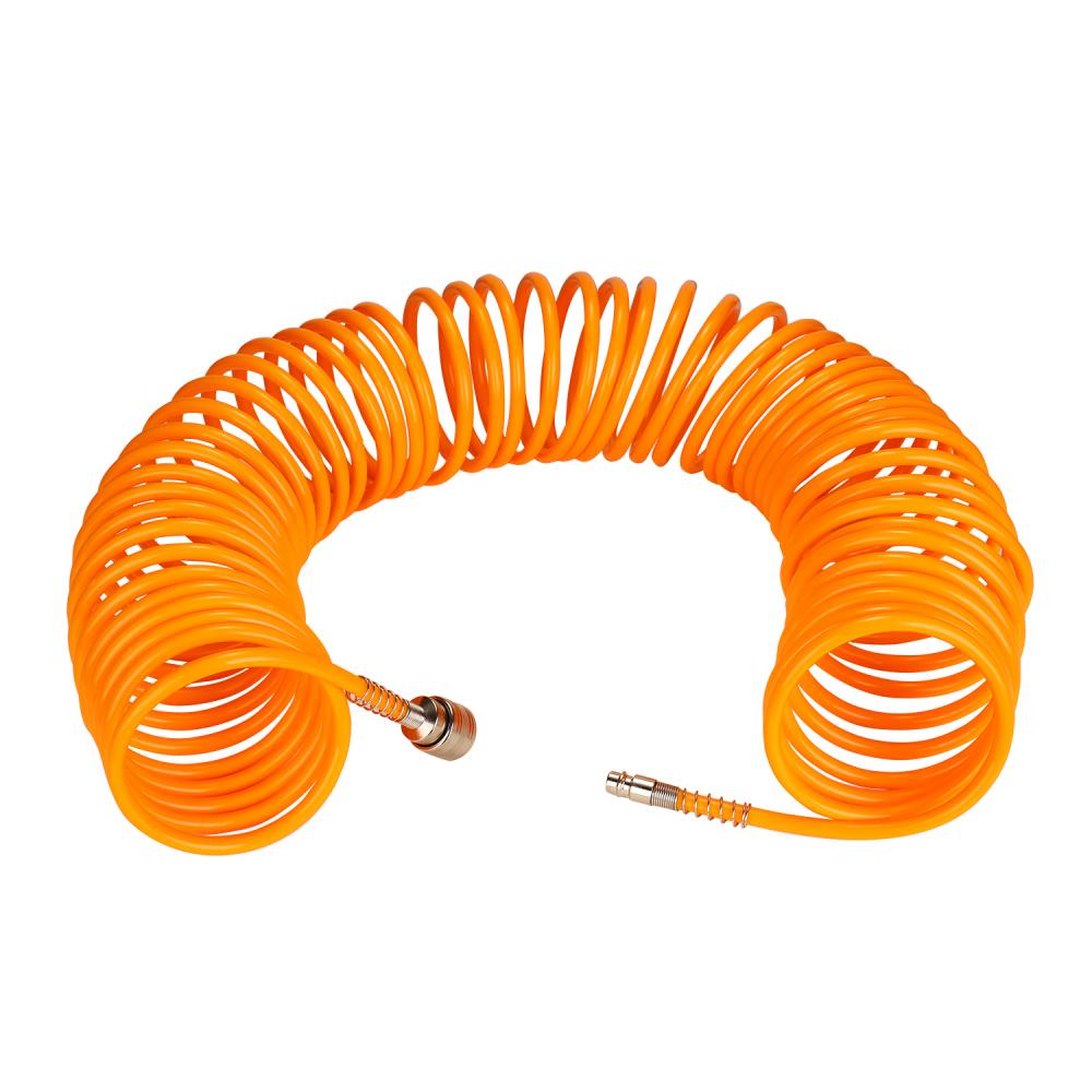 Шланг пневматический спиральный DEKO DKAH15 предназначен для подключения пневмоинструментов к компрессору и служит его удлинителем. Байонетное соединение обеспечивает удобное и быстрое подключение/отключение к пневмомагистрали. Длина шланга позволяет осуществлять работы в удаленном от компрессора месте. Спиральное исполнение предотвращает перегибы и увеличивает удобство при использовании и хранении.Технические характеристики:Внешний диаметр шланга: 8 ммВнутренний диаметр шланга: 5 ммТип соединения:  рапид (EURO)Максимальное давление: 12 БарРабочее давление: 6-8 БарДлина шланга: 15 мКомплектация: Шланг пневматический спиральный - 1 шт