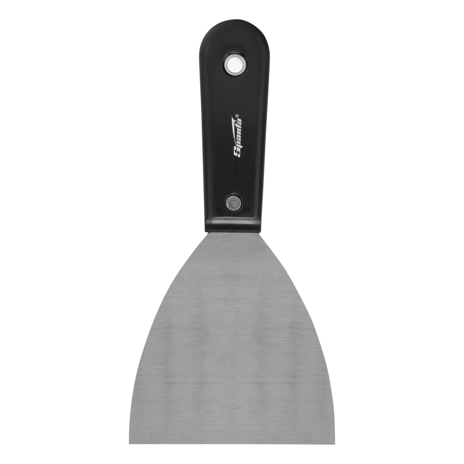 Стальная шпательная лопатка Sparta 852425 шириной 100 мм, полированная, с пластмассовой ручкой, станет незаменимым помощником при проведении строительных и ремонтных работ. Пригодится мастерам для нанесения, выравнивания и сглаживания различных клеевых и строительных растворов.