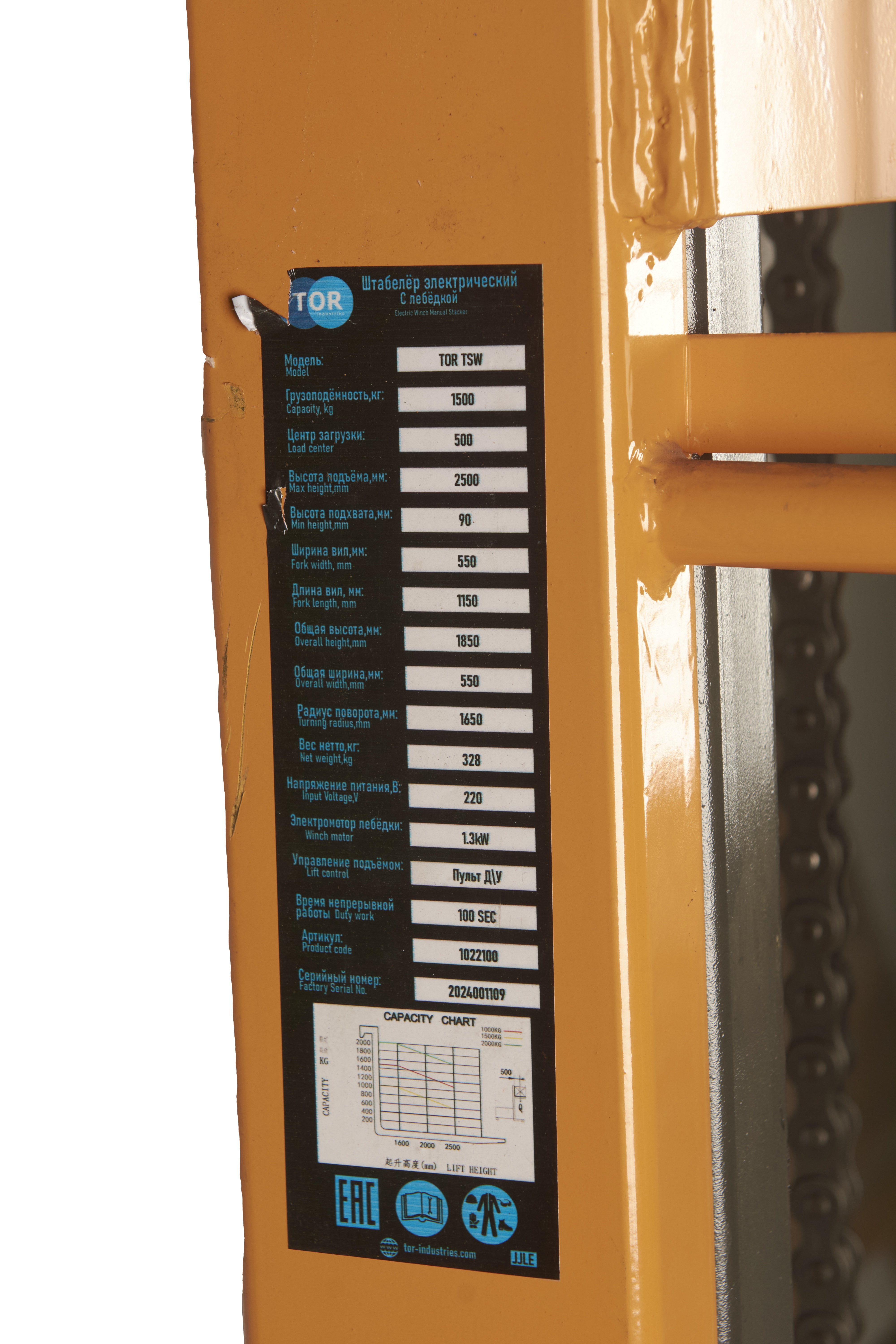 Штабелер с электроподъемом 1,5 т 1,6 м TOR TSW с лебедкой и пультом в Санкт-Петербурге