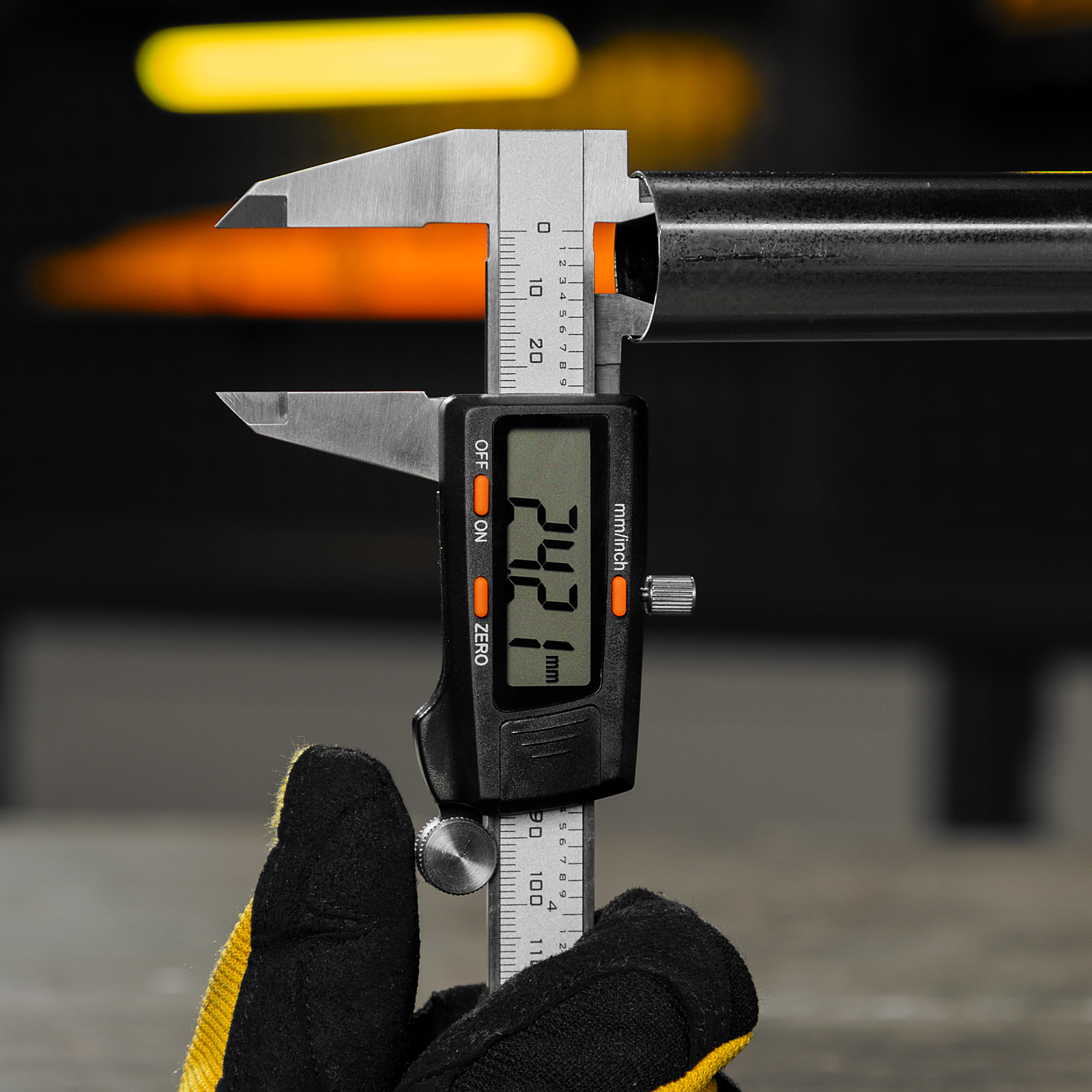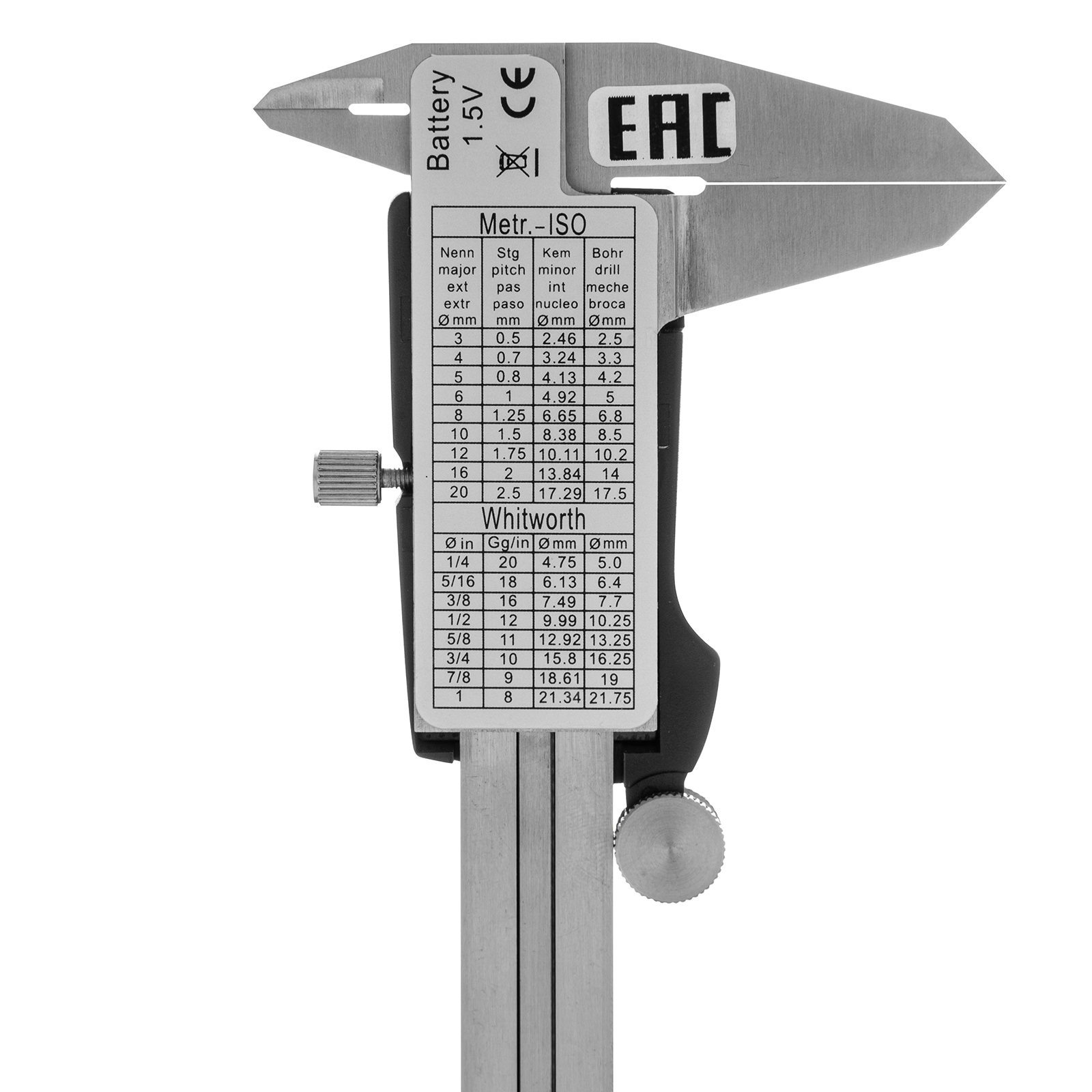Электронный штангенциркуль Denzel 31613 со шкалой длиной 150 мм и глубиномером позволяет определять внутренние и внешние размеры различных деталей. Цена деления составляет 0,01 мм. Штангенциркуль позволяет получать результаты высокой точности: погрешность составляет ±0,02 мм при измерении размеров до 100 мм, и ±0,03 мм — до 150 мм. Двустороннее положение губок облегчает проведение работ. Инструмент пригодится на производстве, в мастерской, гараже, а также будет полезен в быту.