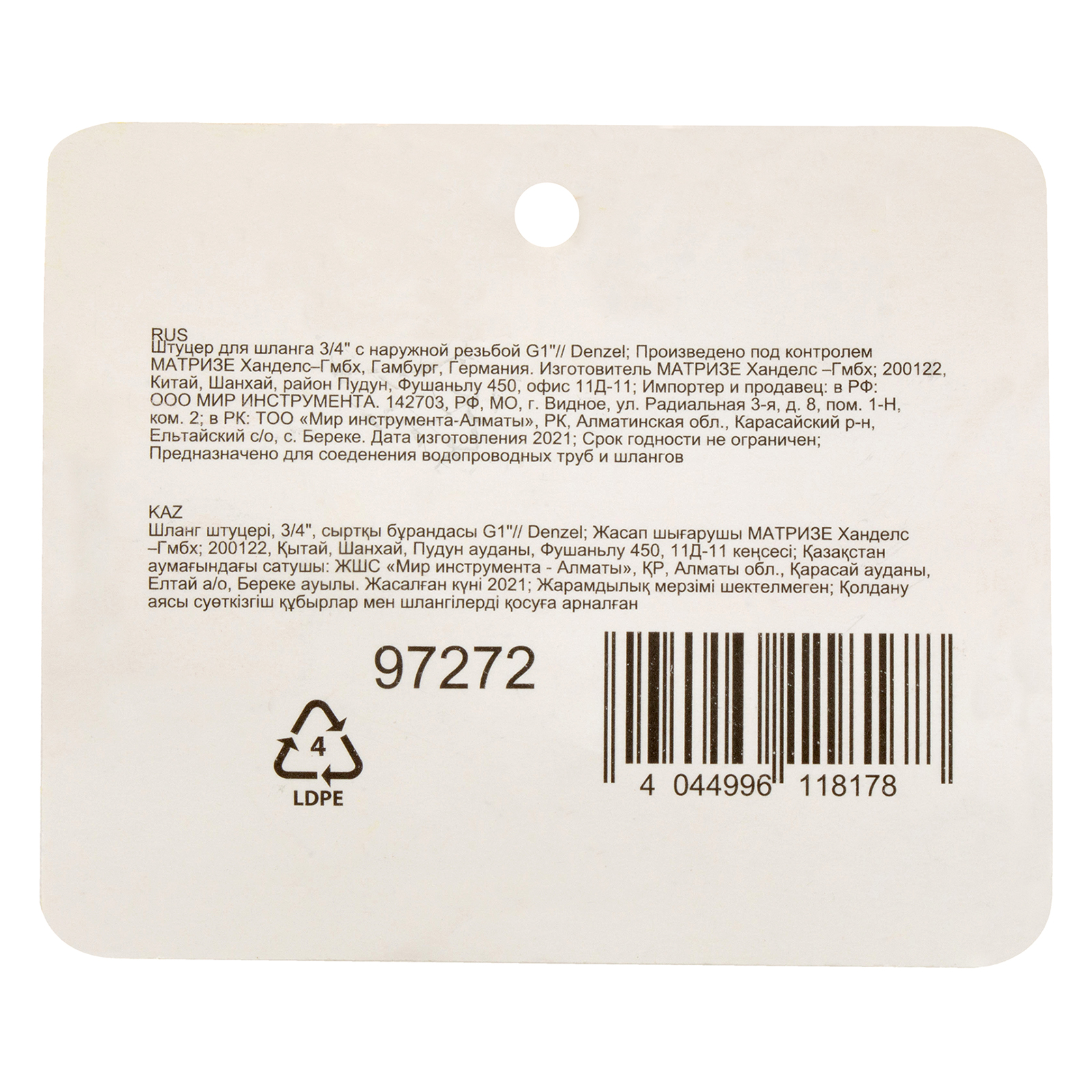 Штуцер для шланга 3/4" с наружной резьбой G1" Denzel