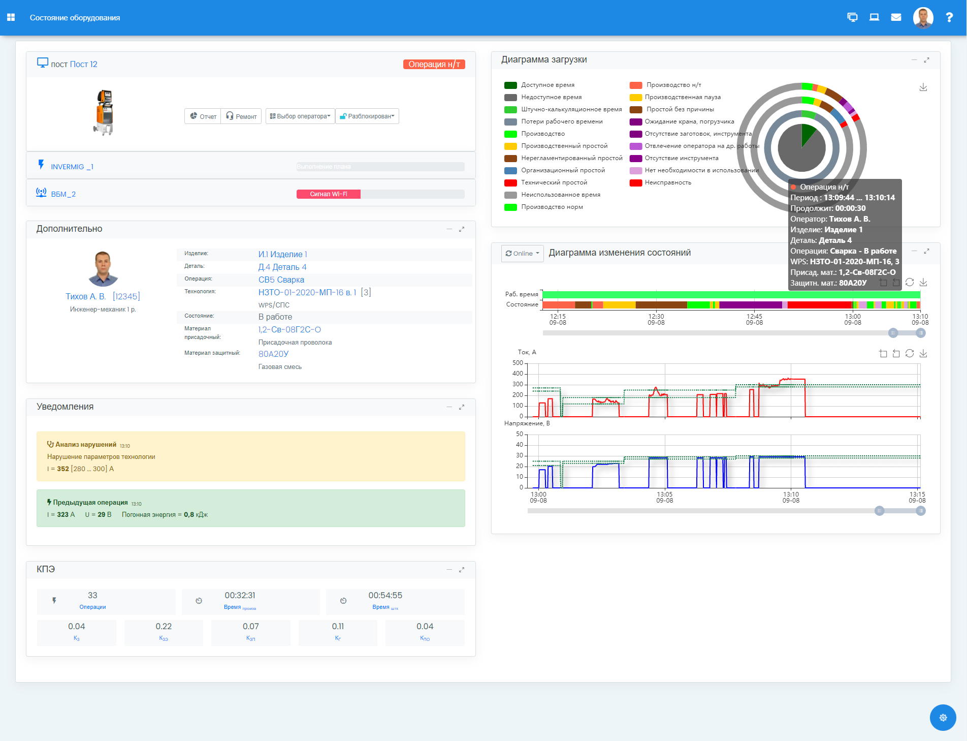 Система мониторинга предприятия Foxweld СМП 1.0СМП 1.0 – система управления сварочными процессами, представляющая собой программно-аппаратный комплекс, предназначена для эффективного управления процессами электродуговой сварки (MMA, TIG, SAW, MIG/MAG) на производстве. Она обладает широким функционалом, с помощью которого можно отслеживать несоответствия технологического процесса заданным параметрам, уровень загрузки оборудования и персонала, продолжительность и причины простоев сварочных установок, количество использованных в ходе сварочных работ расходных материалов; предоставлять доступ к оборудованию по RFID-идентификатору; управлять аттестацией сварщиков; формировать аналитические отчеты; осуществлять контроль выполнения плана. Интерактивный мониторингКомплекс Foxweld СМП 1.0 в режиме реального времени отслеживает работу оборудования и сварщиков, что позволяет контролировать загрузку и состояние парка, а также выполнение плана предприятия.Контроль технологииСистема обеспечивает ввод технологических карт сварки швов, сбор данных о параметрах сварочного процесса, сравнивает фактические значения параметров с заданными, выявляет нарушения технологии сварки, формирует и рассылает уведомления о нарушениях.  Аттестация сварщиковFoxweld СМП 1.0 регулирует работу, связанную с подтверждением квалификации персонала: документирует процессы аттестации, позволяет создавать, вводить в систему и отзывать сертификаты, уведомляет о приближении срока окончания действия сертификатов, дает возможность планировать и назначать аттестации.Техническое обслуживание и ремонт оборудованияПрограмма дает возможность сопровождать планирование обслуживания оборудования. С ее помощью можно формировать графики планового ТО и ремонта, назначать внеплановые работы по техобслуживанию и ремонту, создавать заказ-наряды, вести статистику по отказам оборудования, расходам материалов и запчастей.  Аналитические отчетыНа основании собранных данных система Foxweld СМП 1.0 формирует отчеты, предоставляющие исчерпывающие сведения об эксплуатации оборудования и действиях сварщиков: время простоев и работы, ключевые показатели эффективности, выполнение плана производства, неисправности и нарушения, используемые технологии и их соблюдение, расход ресурсов.ПРЕИМУЩЕСТВА:Преимущества:·возможность развертывания в локальной сети предприятия или в облаке·отсутствие влияния на гарантию производственного оборудования·возможность подключения сварочных аппаратов сторонних производителей·универсальность: система может быть расширена до возможности сопровождать производственные процессы всего предприятия – резку, фрезерование, сверление, штамповку и гибку металла, а также сборку и слесарные работы·способность обеспечивать мониторинг всей номенклатуры станков – любых производителей и любого года выпуска.Применение:система Foxweld СМП 1.0 может применяться для управления процессами электродуговой сварки в сварочных цехах любых предприятий, а также для сопровождения операций по подготовке металлических заготовок на производственных площадках, где осуществляется изготовление металлических конструкцийКОМПЛЕКТАЦИЯ:Состав:  программное обеспечение для серверной части (на количество до 50, до 500 или более 500 постов)  программное обеспечение для пул