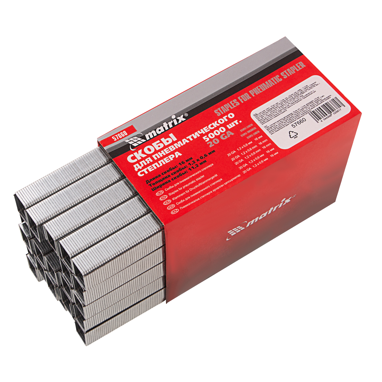 Скобы Matrix 57660 типа 20GA, 5000 шт. в упаковке, подходят к пневматическим степлерам, работающим с крепежами сечением 1,2 х 0,6 мм, длиной 16 и шириной 11,2 мм. Их используют для перетяжки мебельной обивки, закрепления ковролина, утепления стен.