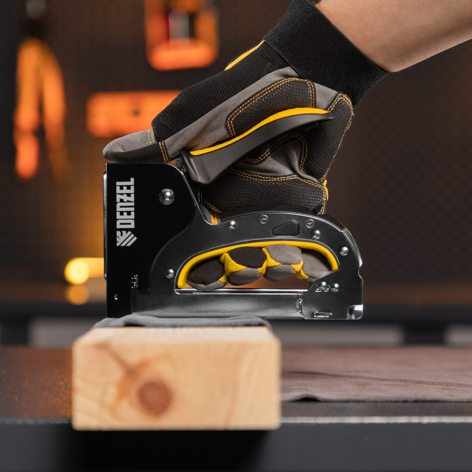 Мебельный степлер Denzel 40211 со стальным корпусом, регулировкой силы удара и функцией быстрой загрузки работает со скобами типа 53 размером 4-14 мм. Используется для фиксации на деревянном основании фанеры, ДВП, оргалита, ткани, утеплителя. Силу удара можно регулировать в зависимости от толщины материала, что обеспечивает высокое качество работ. Степлер будет полезен для обивки мебели, пригодится во время ремонта.