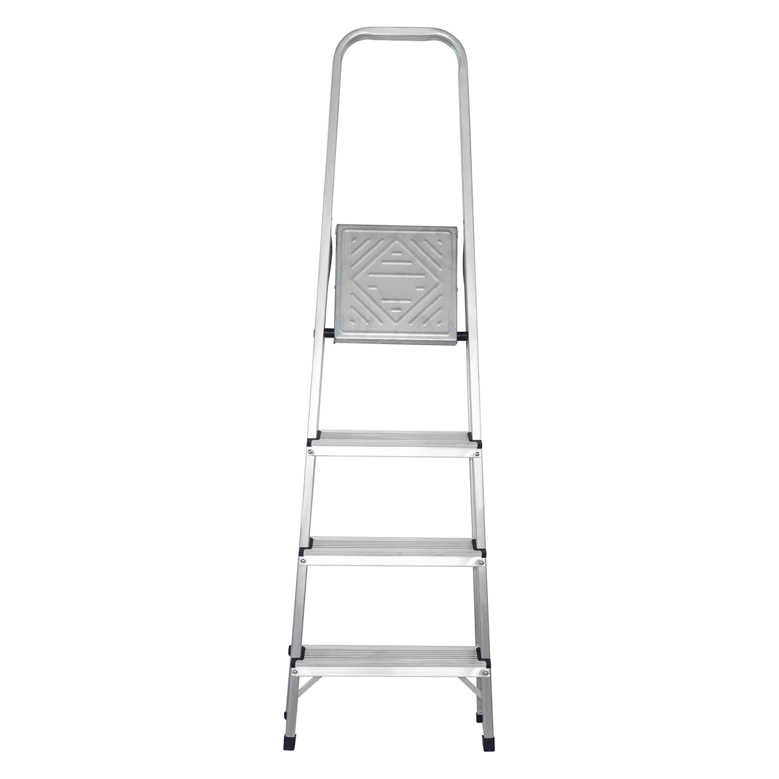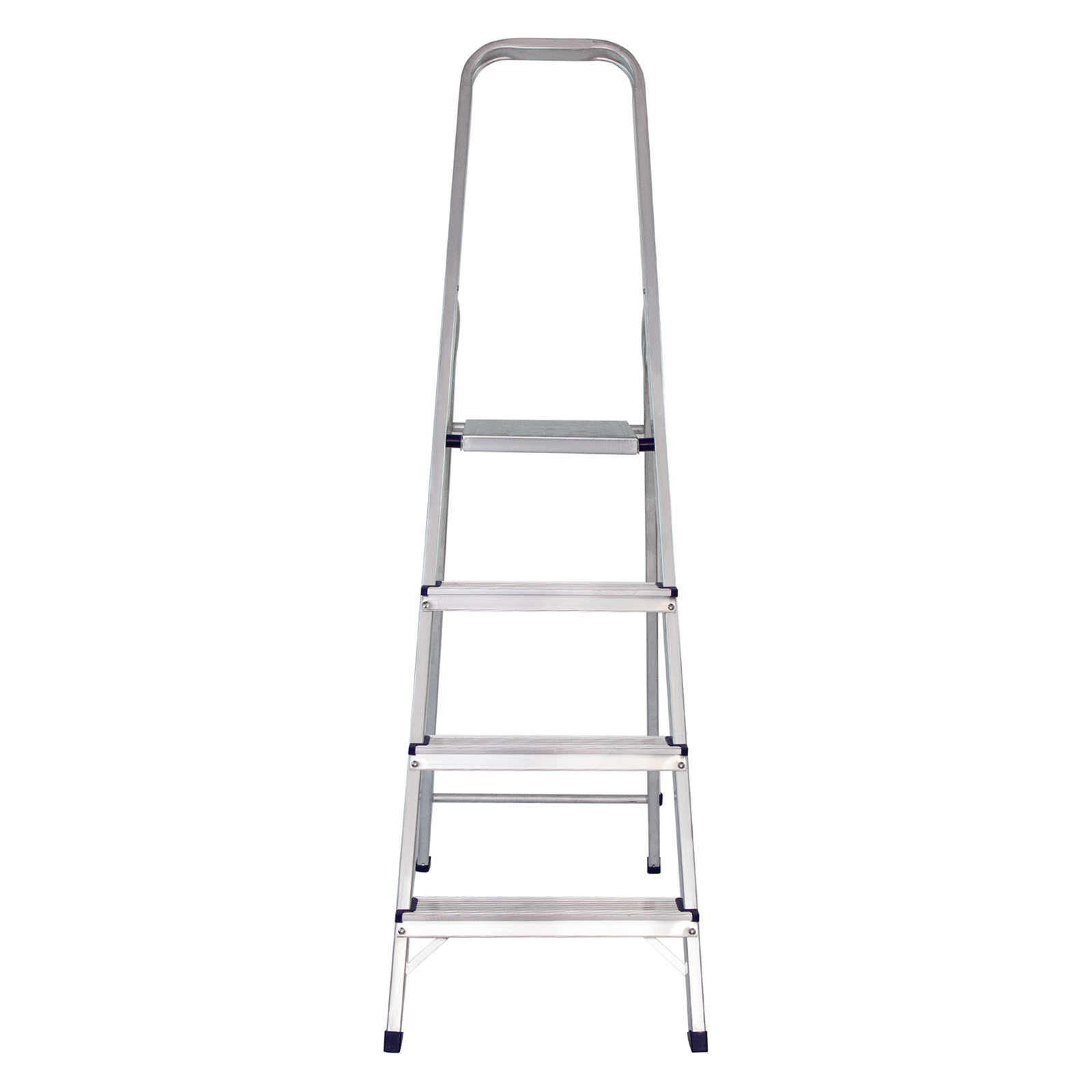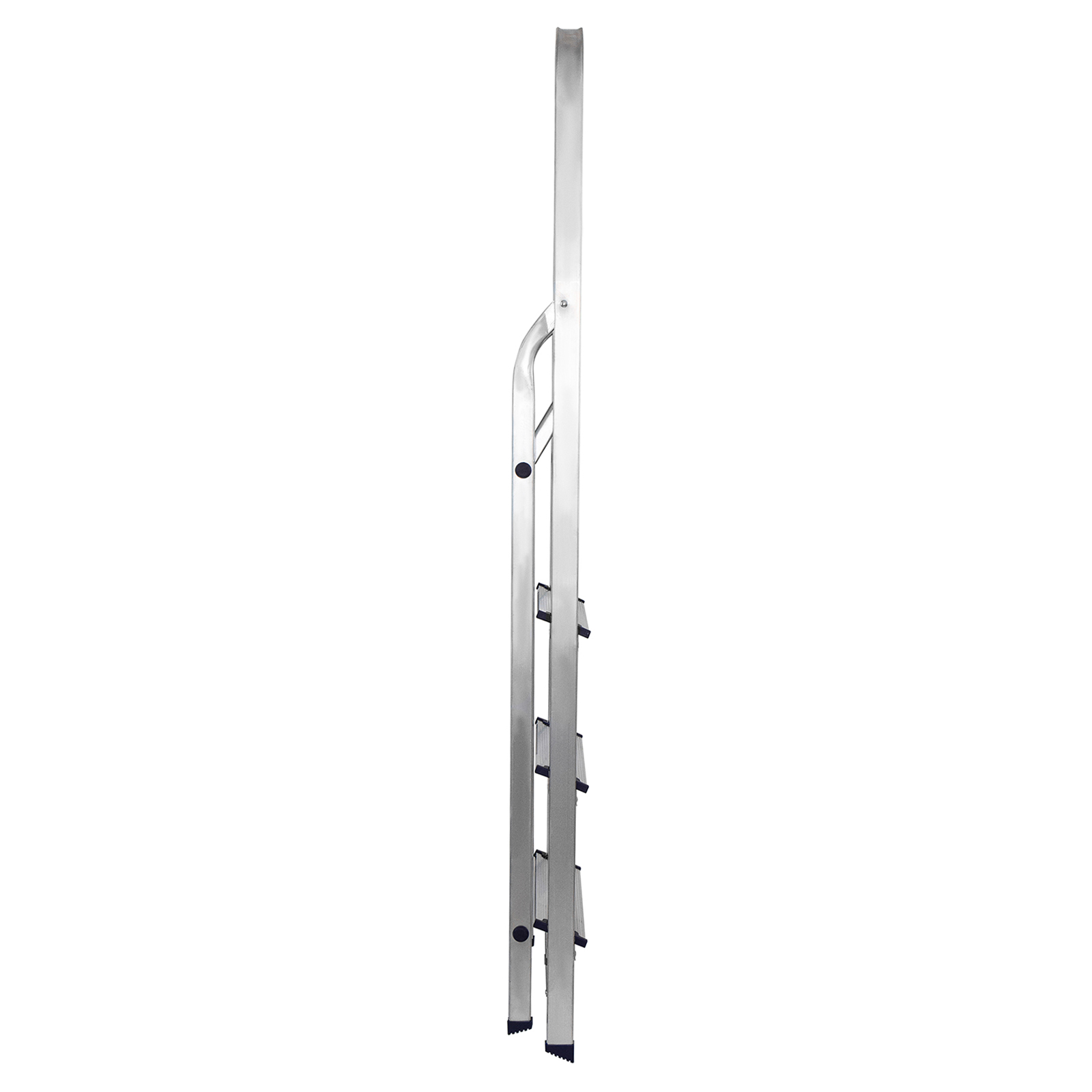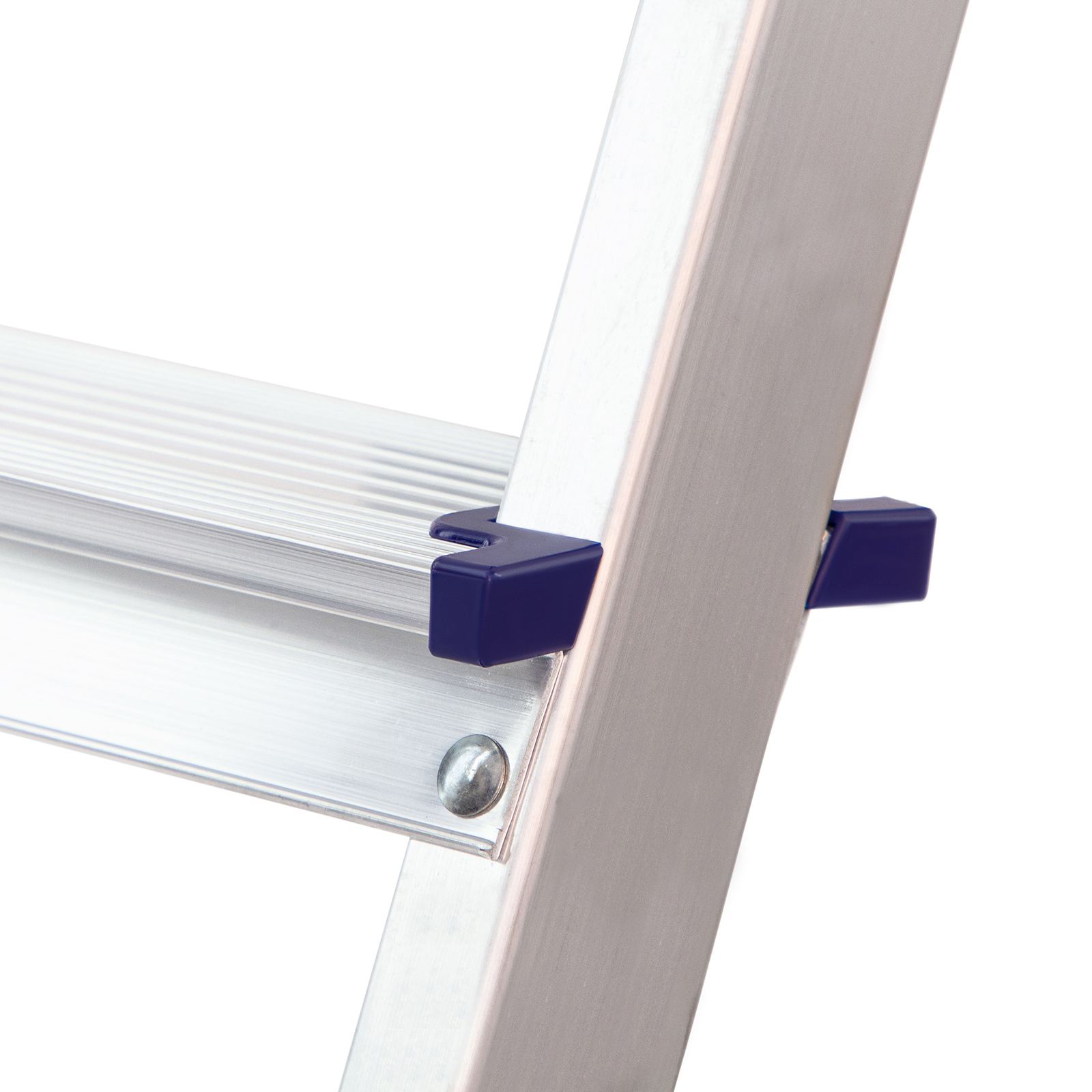 - Надежность — рама из прямоугольного алюминиевого профиля выдерживает нагрузку до 150 кг, широкие ступени закреплены заклепками.