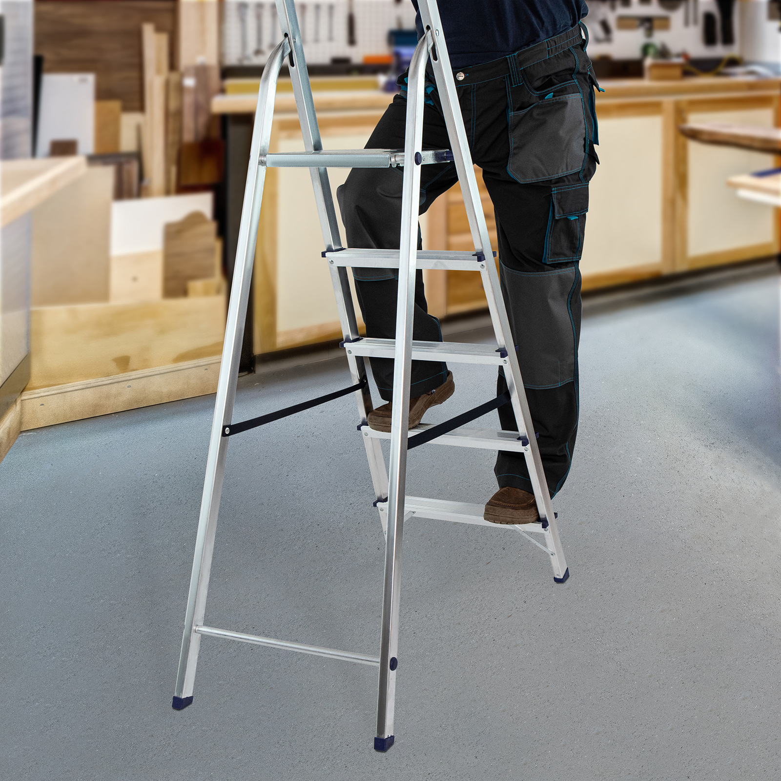 Стремянка устанавливается на плоскую поверхность и не предназначена для работы с электроинструментом.