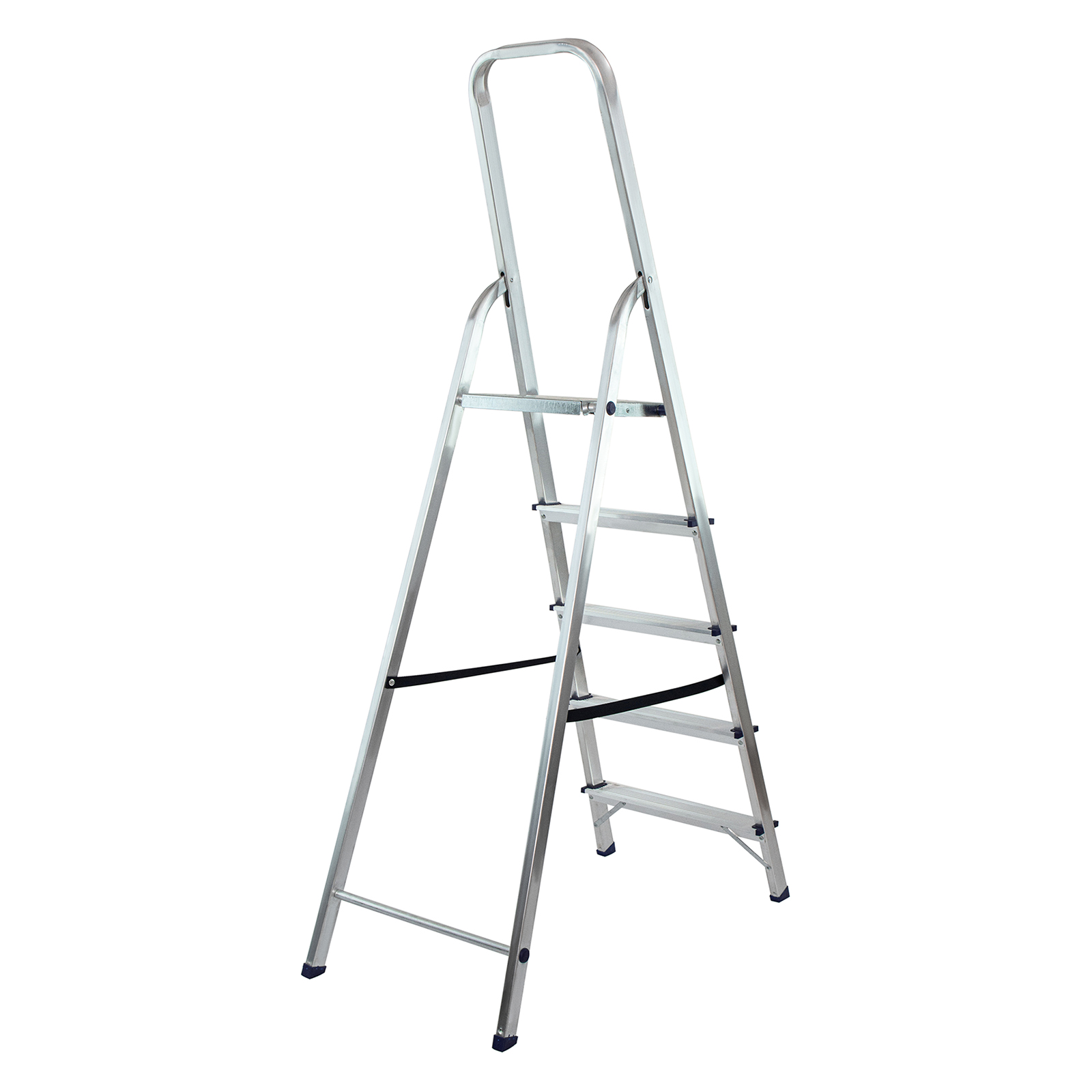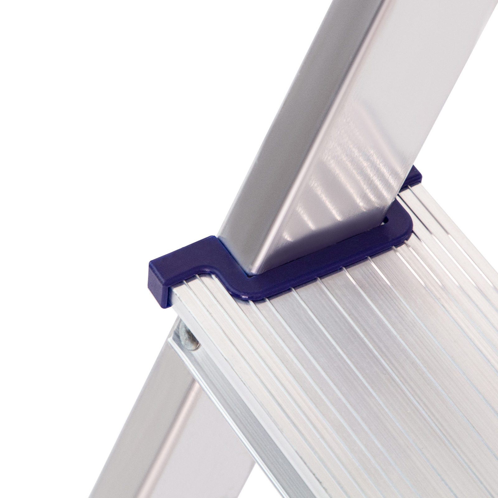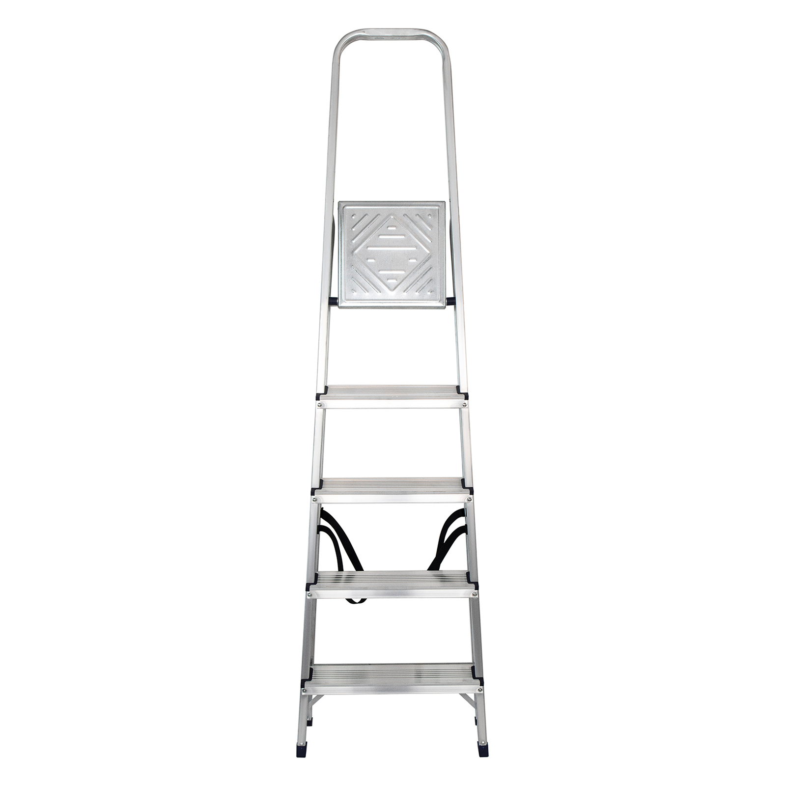 - Надежность — рама из прямоугольного алюминиевого профиля выдерживает нагрузку до 150 кг, широкие ступени закреплены заклепками, страховочные стяжки повышают прочность конструкции.