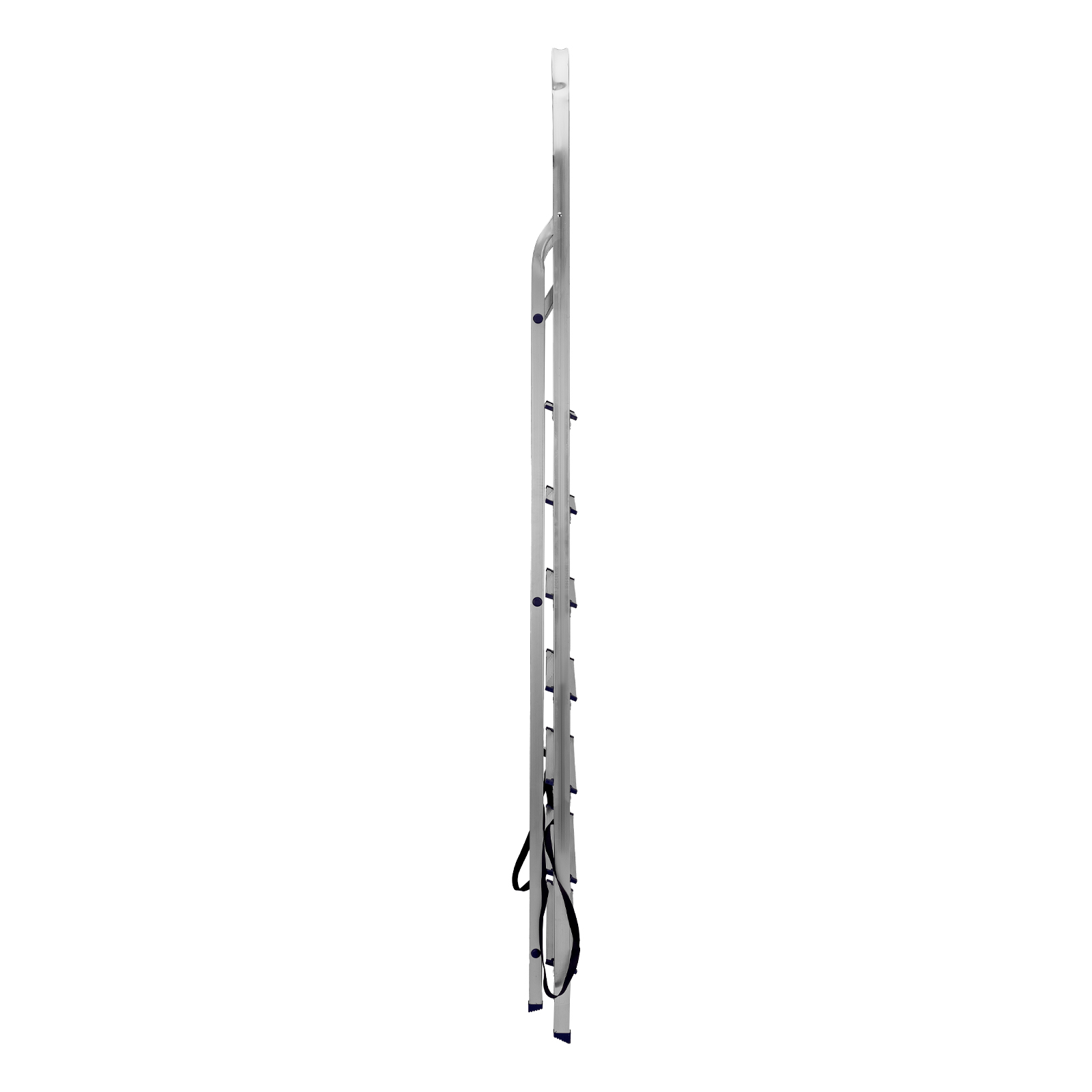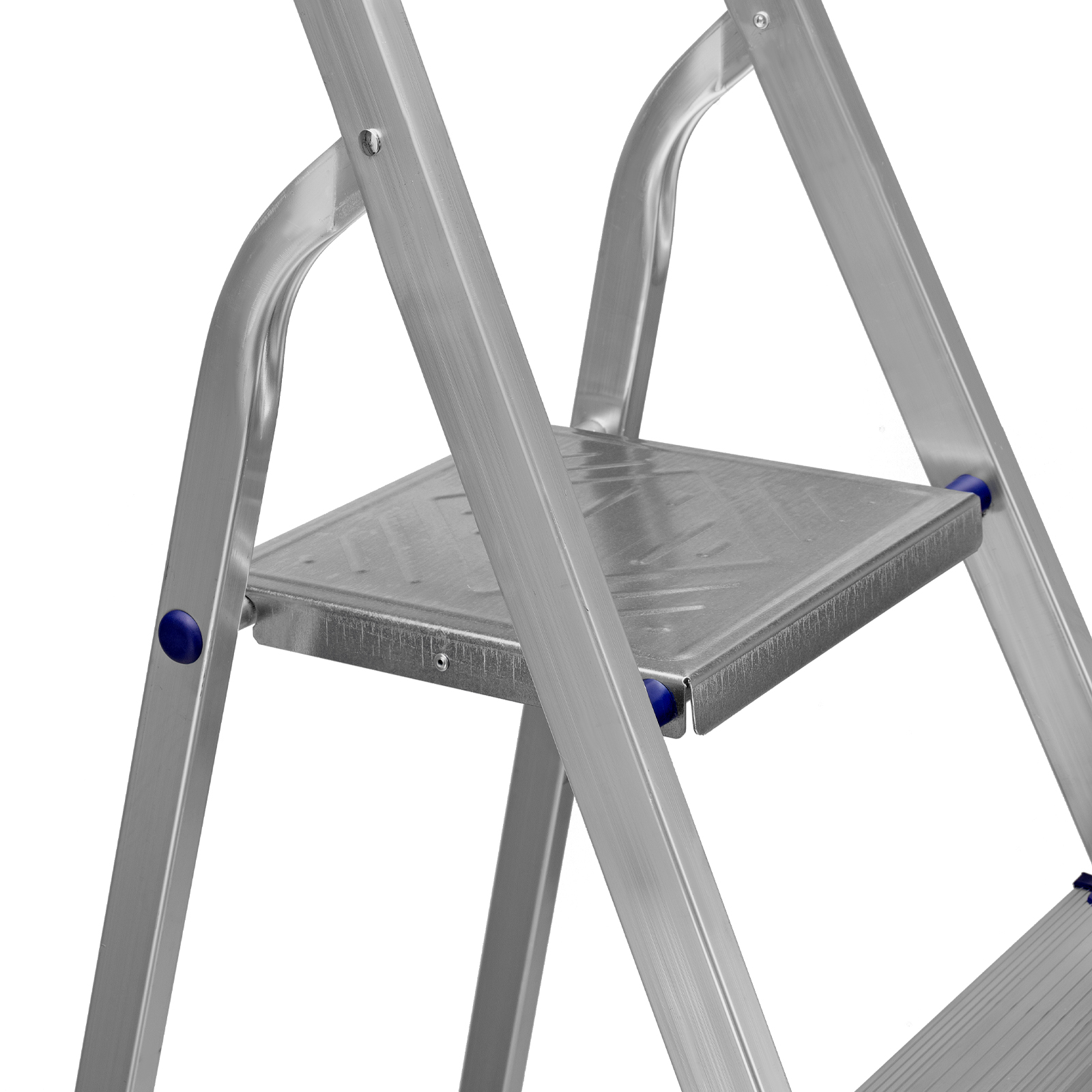 • Надежность — рама из прямоугольного алюминиевого профиля выдерживает нагрузку до 150 кг, широкие ступени закреплены заклепками, страховочные стяжки повышают прочность конструкции.