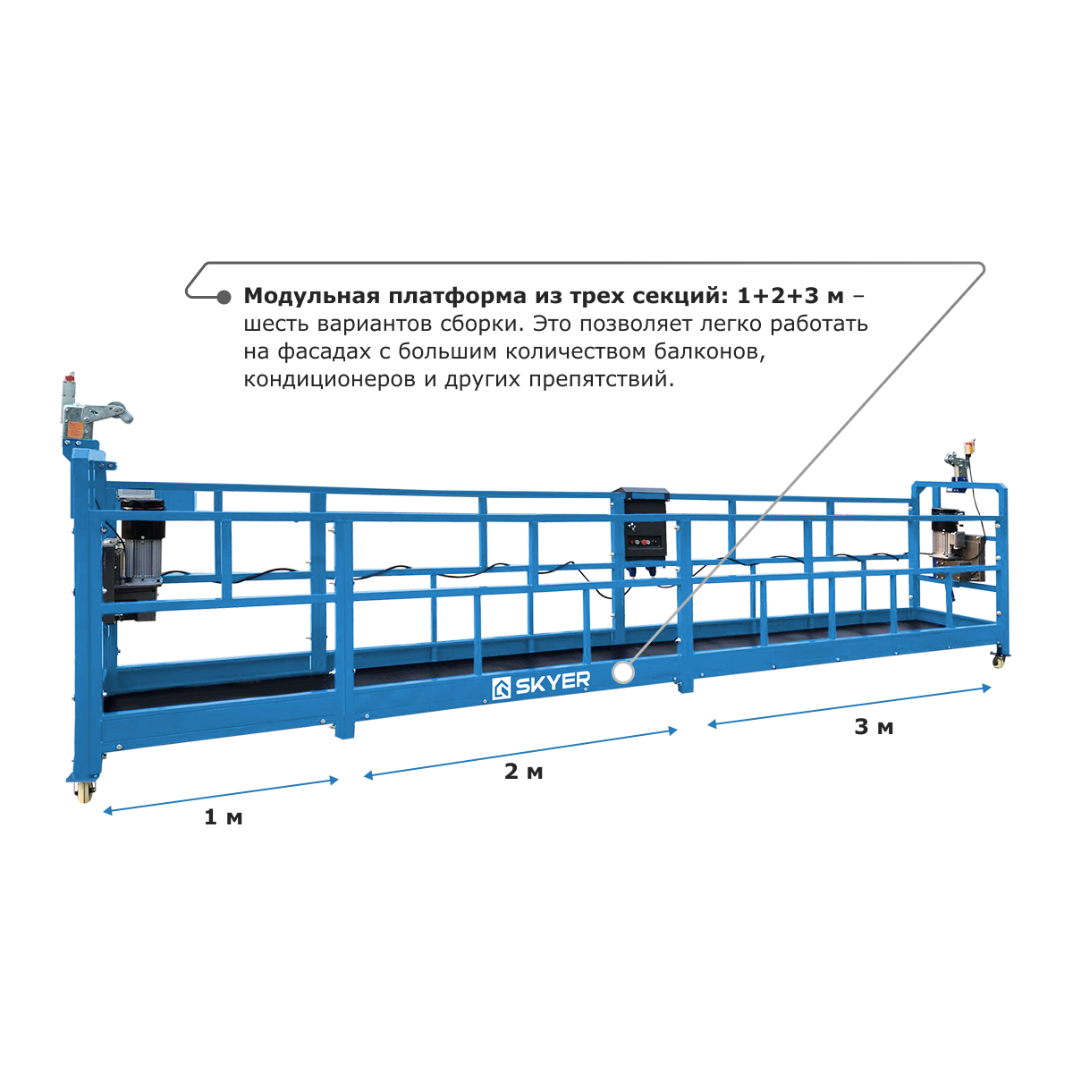 - Модульная платформа из трех секций: 1+2+3 м – шесть вариантов сборки. Это позволяет легко работать на фасадах с большим количеством балконов, кондиционеров и других препятствий.