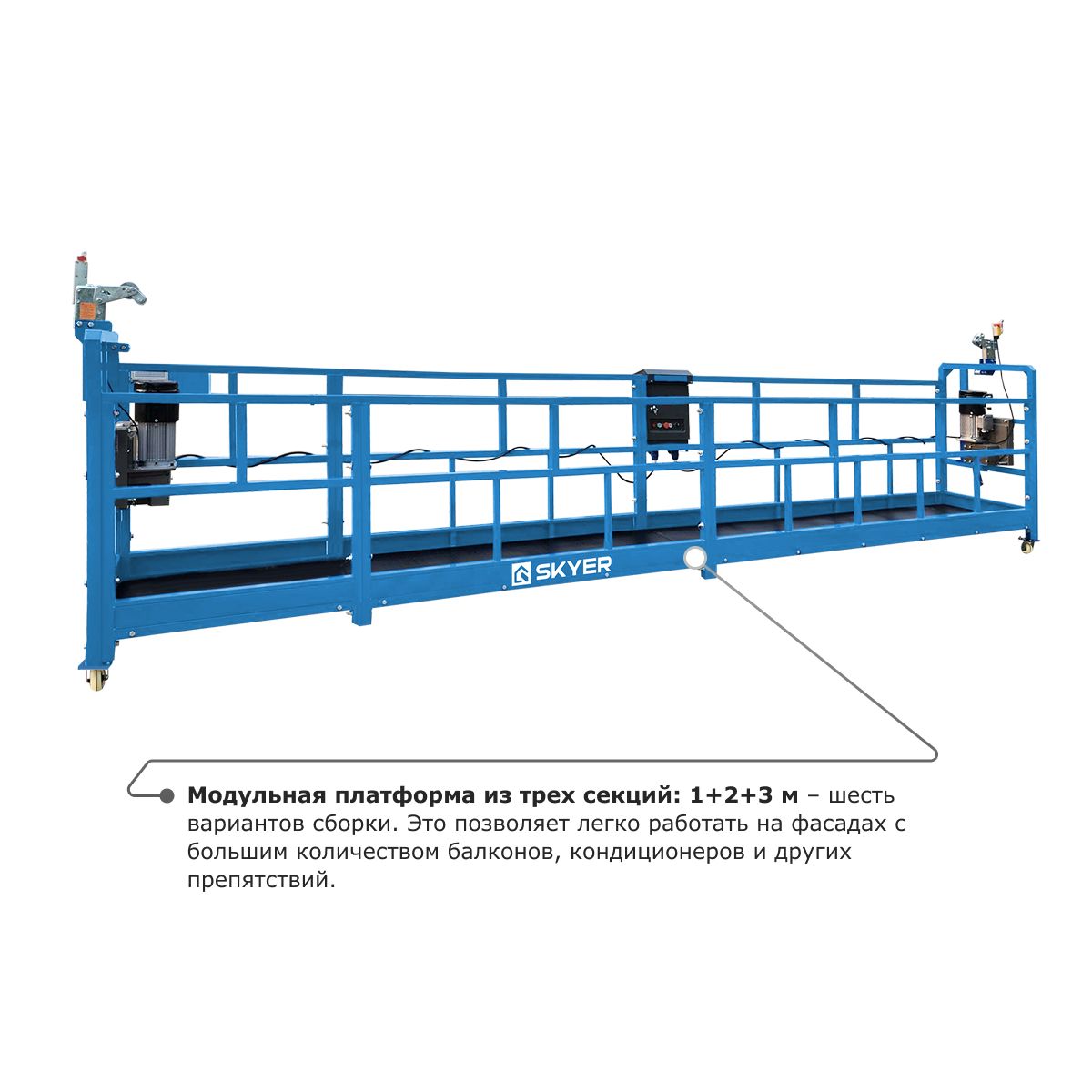 • Модульная платформа из трех секций: 1+2+3 м – шесть вариантов сборки. Это позволяет легко работать на фасадах с большим количеством балконов, кондиционеров и других препятствий.
