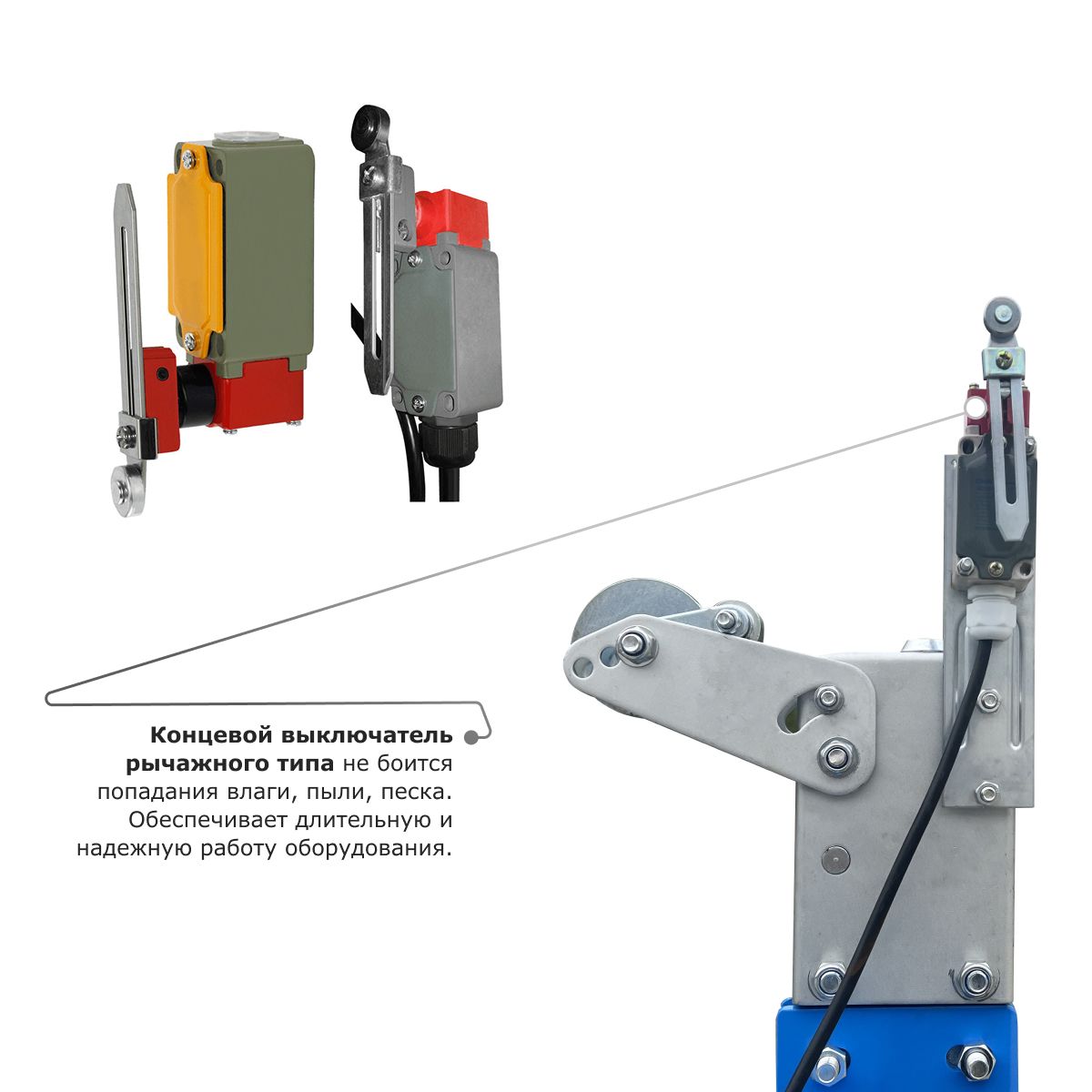 • Концевой выключатель рычажного типа не боится попадания влаги, пыли, песка. Обеспечивает длительную и надежную работу оборудования.