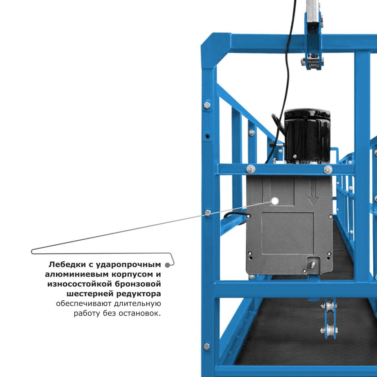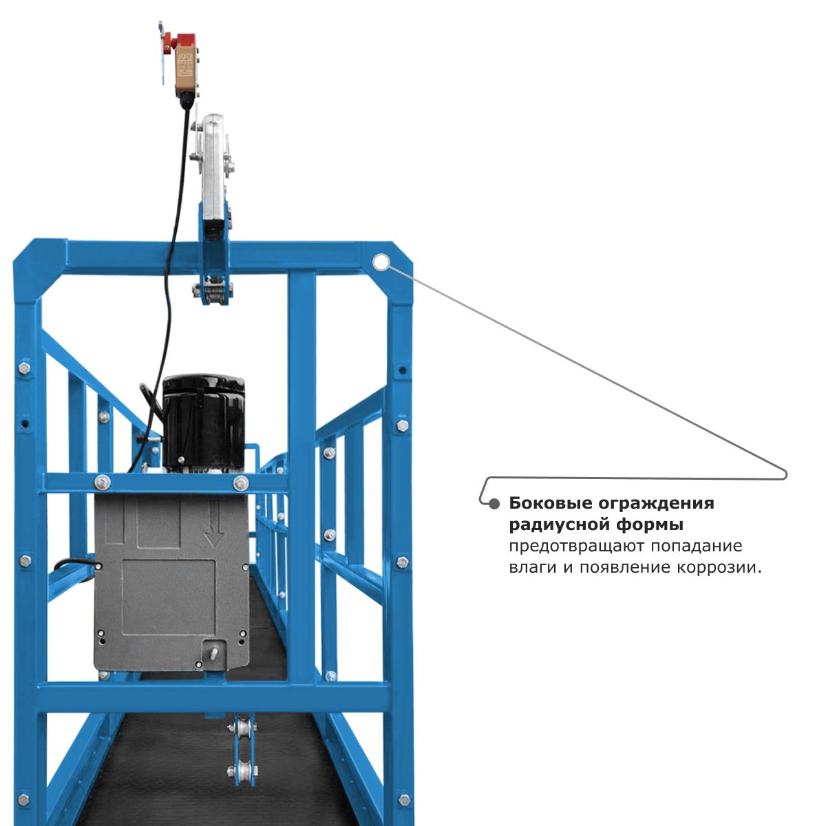 • Металлический отвод троса обеспечивает надежную защиту корпуса люльки и самого троса от протирания и повреждений.