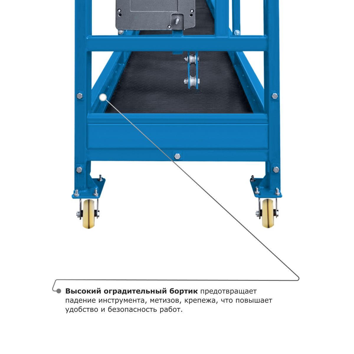 • Высокий оградительный бортик предотвращает падение инструмента, метизов, крепежа, что повышает удобство и безопасность работ.