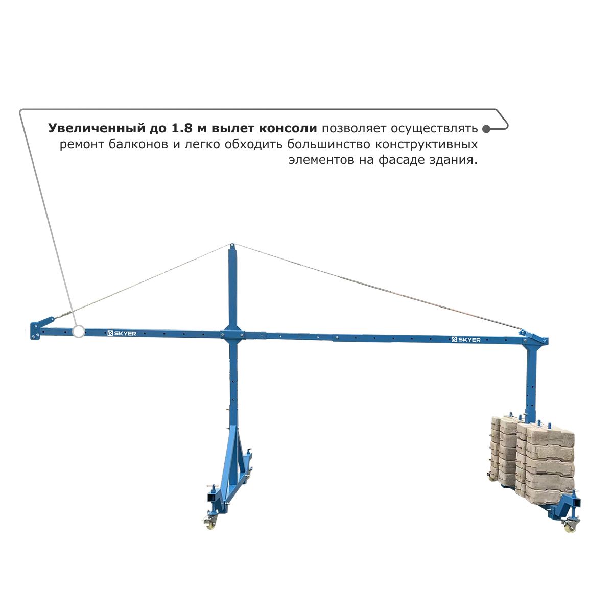 • Увеличенный до 1.8 м вылет консоли позволяет осуществлять ремонт балконов и легко обходить большинство конструктивных элементов на фасаде здания.
