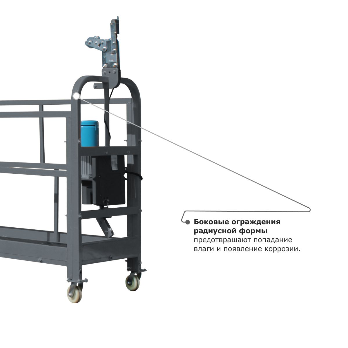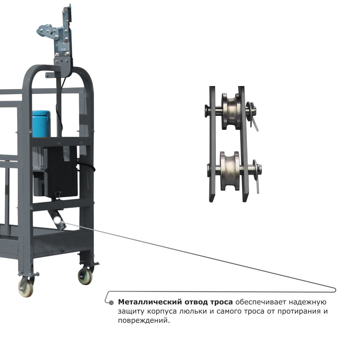 - Металлический отвод троса обеспечивает надежную защиту корпуса люльки и самого троса от протирания и повреждений.