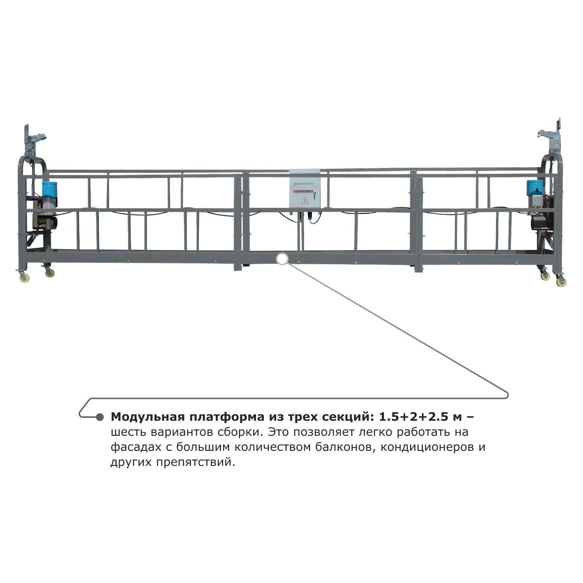 - Модульная платформа из трех секций: 1.5+2+2.5 м – шесть вариантов сборки. Это позволяет легко работать на фасадах с большим количеством балконов, кондиционеров и других препятствий.