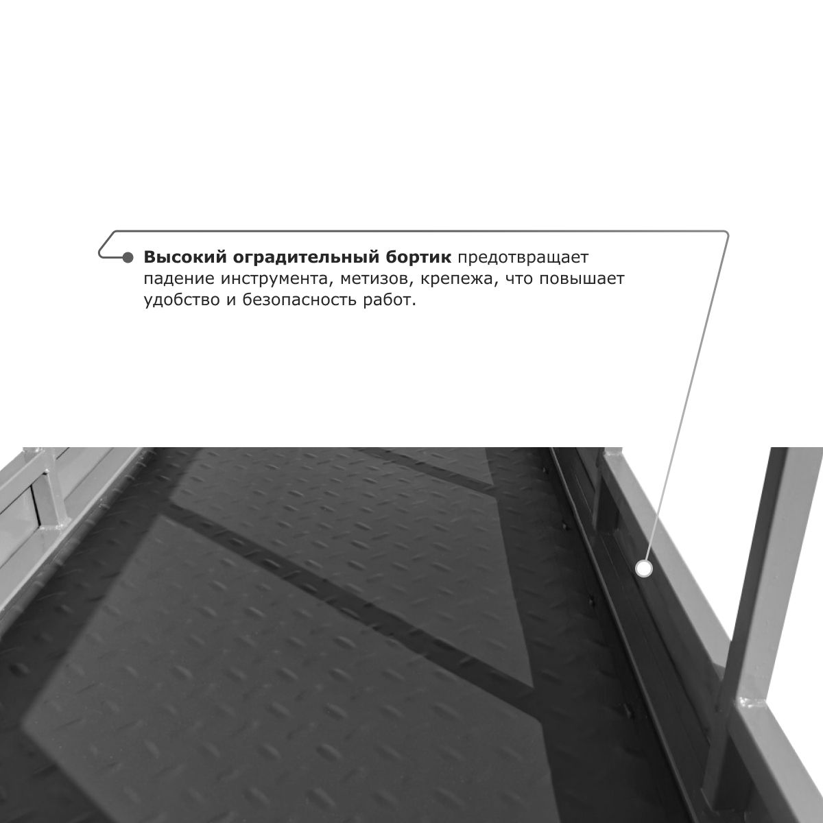 - Высокий оградительный бортик предотвращает падение инструмента, метизов, крепежа, что повышает удобство и безопасность работ.