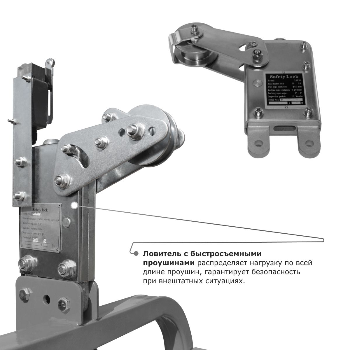 - Ловитель с быстросъемными проушинами распределяет нагрузку по всей длине проушин, гарантирует безопасность при внештатных ситуациях.