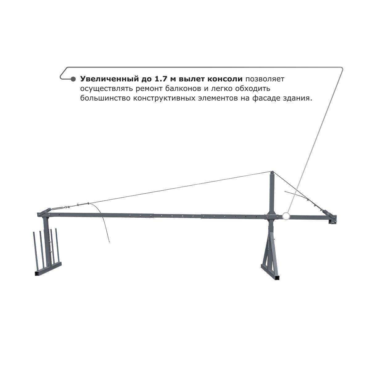 - Увеличенный до 1.7 м вылет консоли позволяет осуществлять ремонт балконов и легко обходить большинство конструктивных элементов на фасаде здания.