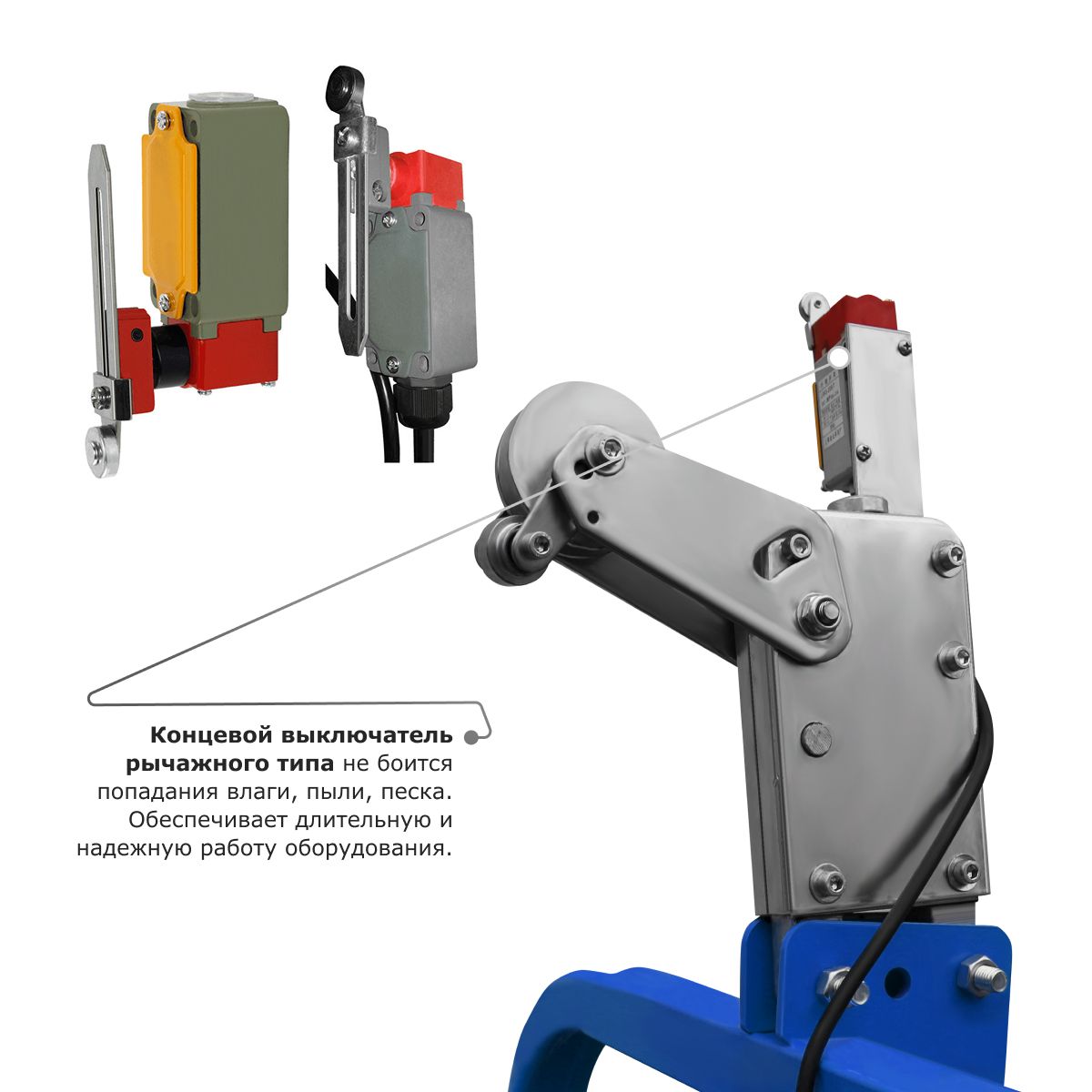 - Концевой выключатель рычажного типа не боится попадания влаги, пыли, песка. Обеспечивает длительную и надежную работу оборудования.