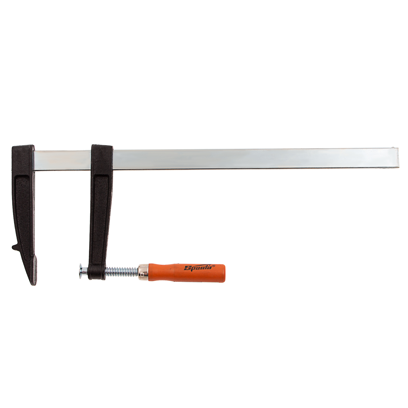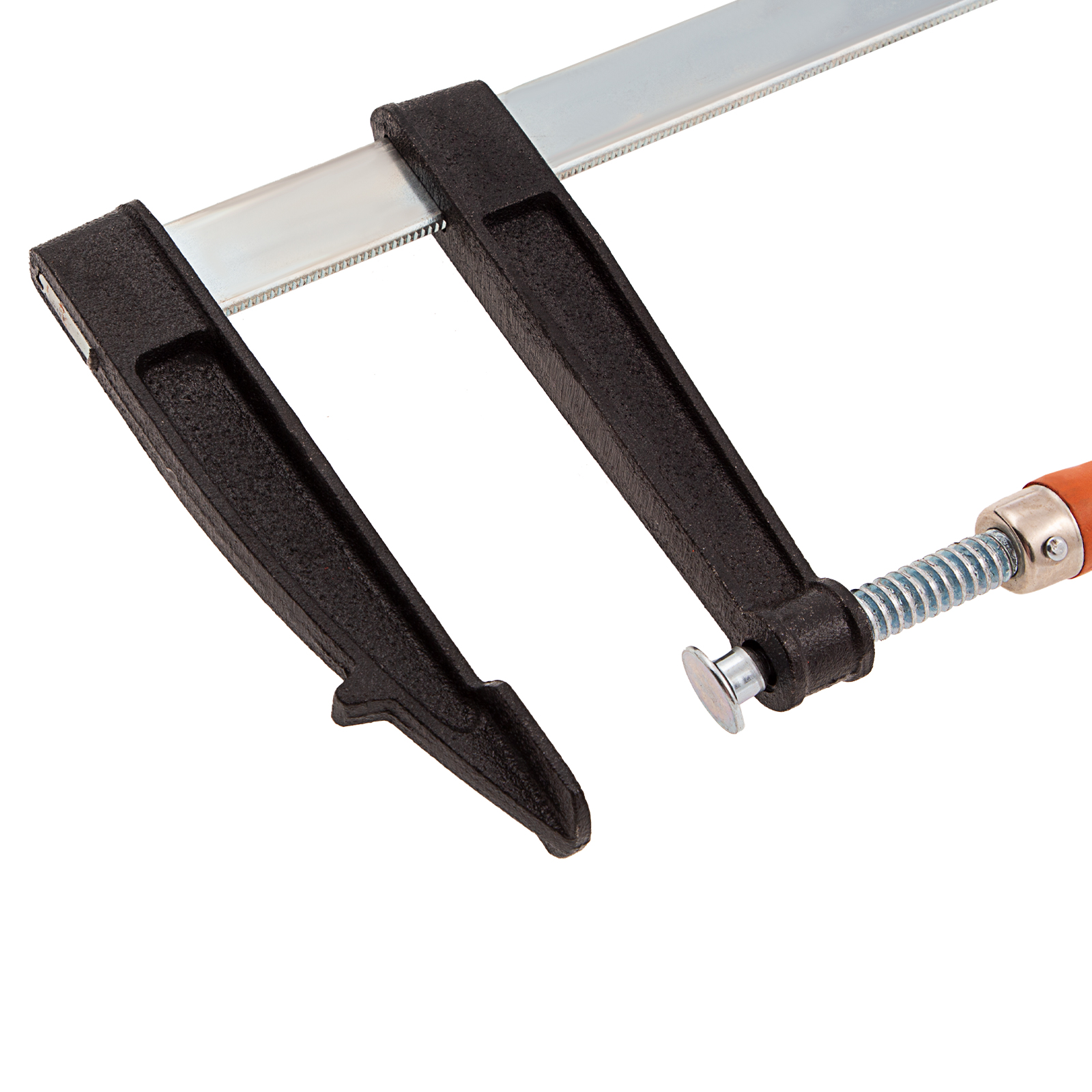 F-образная струбцина Sparta 204405, 400 х 120 х 470 мм, используется в столярном и слесарном деле и позволяет фиксировать заготовки из металла, древесины и других материалов для их соединения или обработки. Деталь помещают между губками, одна из которых подвижна и служит для регулировки величины захвата. Винтовой зажим позволяет прикладывать значительное усилие для надежной фиксации. Защитные накладки предотвращают повреждение детали. Элементы конструкции выдерживают высокую температуру, поэтому струбцина подходит для проведения сварочных работ, при этом пластиковые накладки необходимо снять.