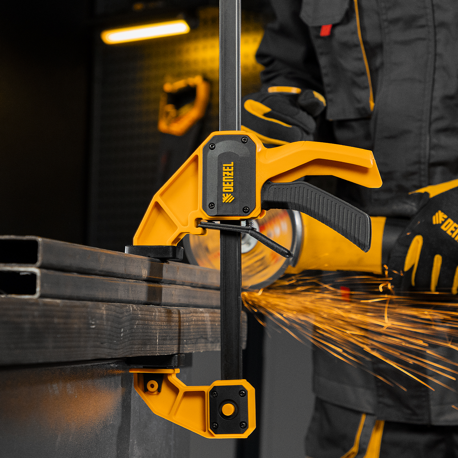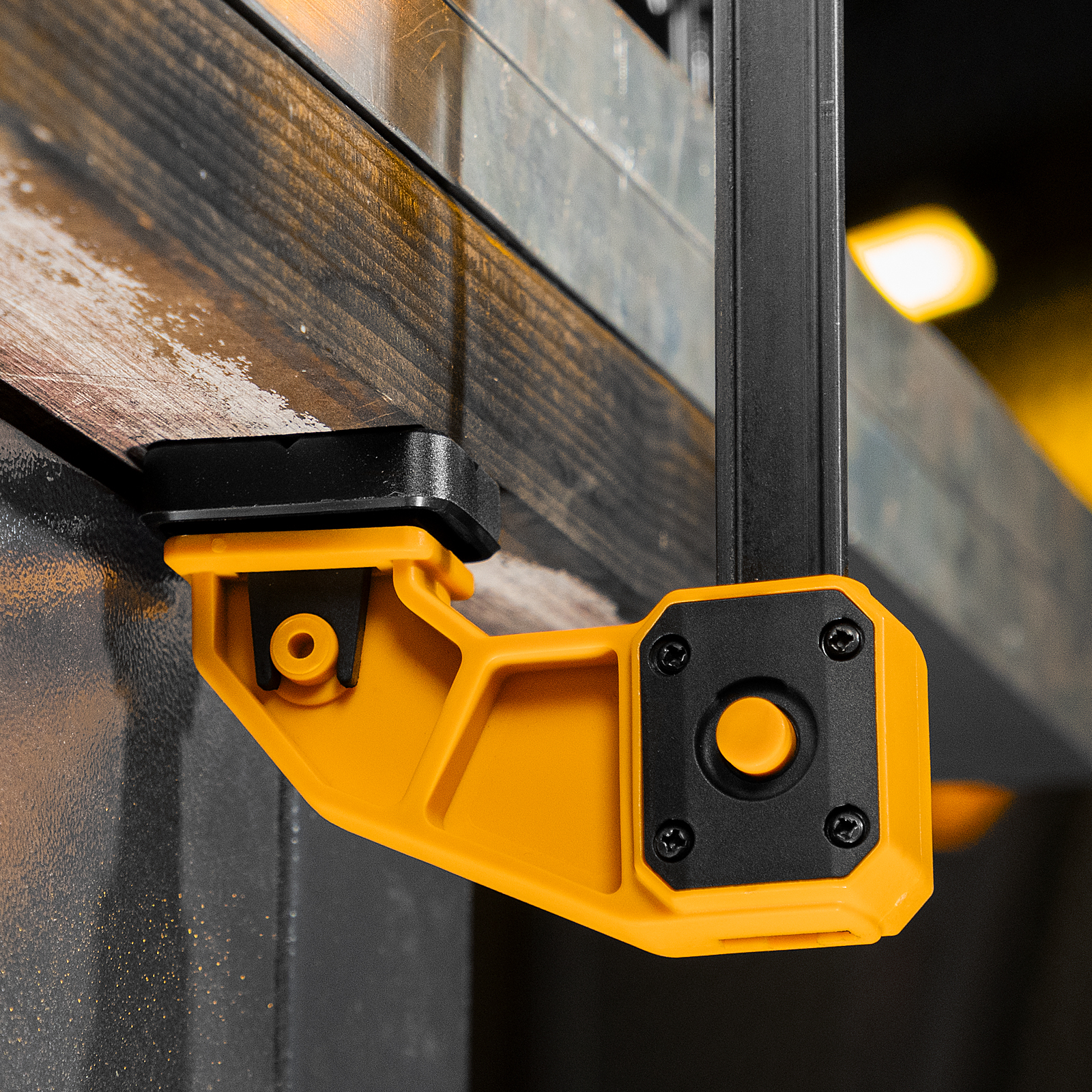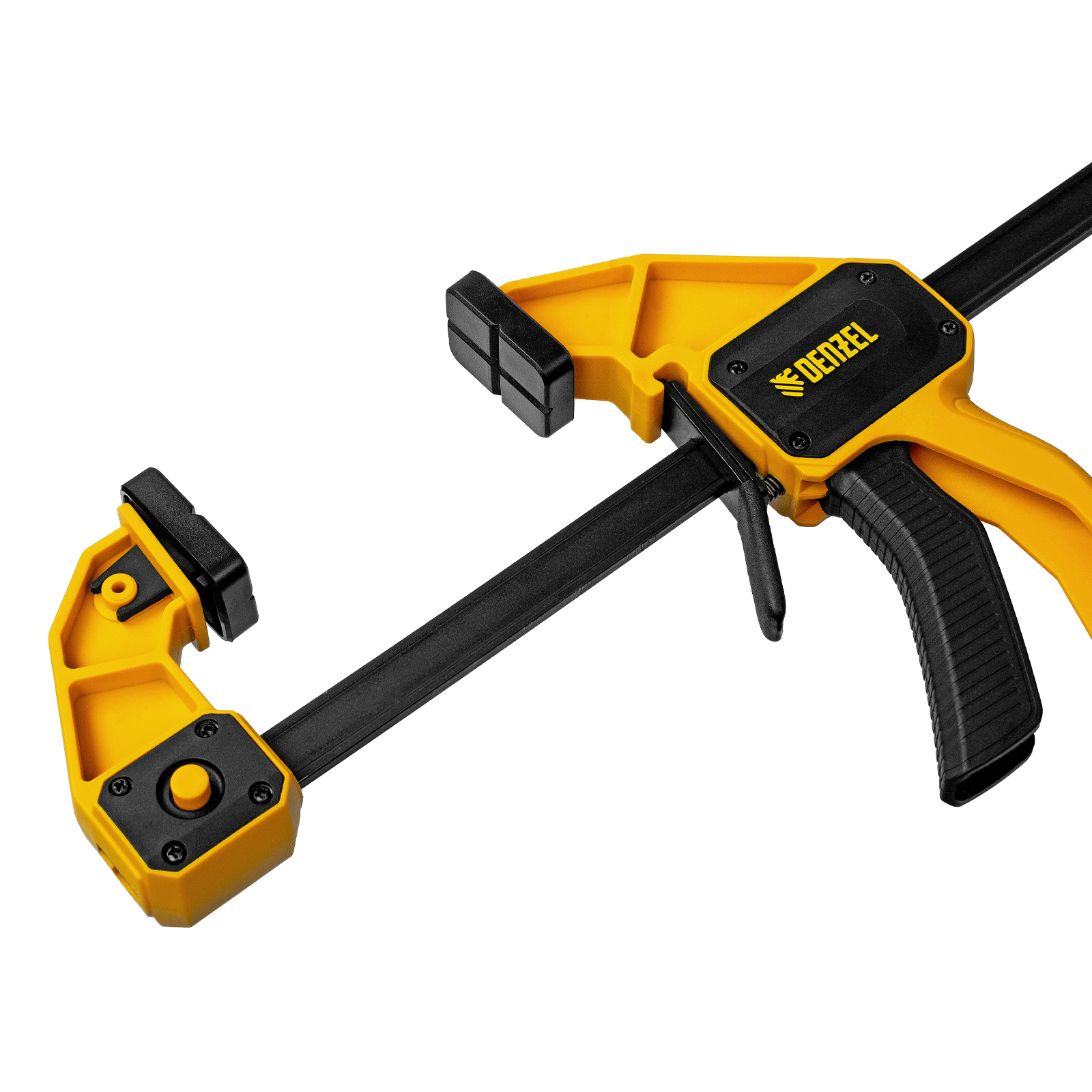 - Комфортное использование — струбцина весит всего 764 г, обрезиненная кнопка фиксации обеспечивает удобный захват.