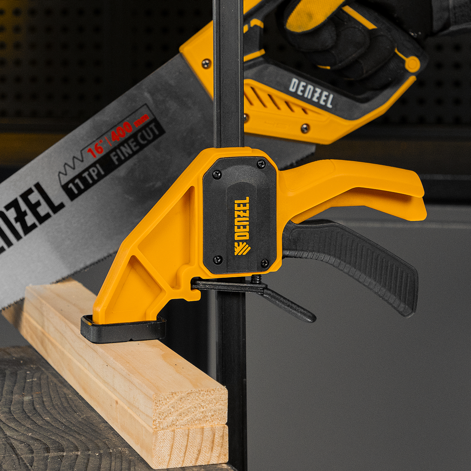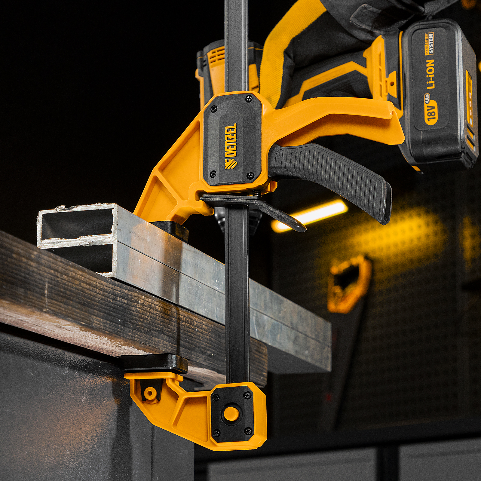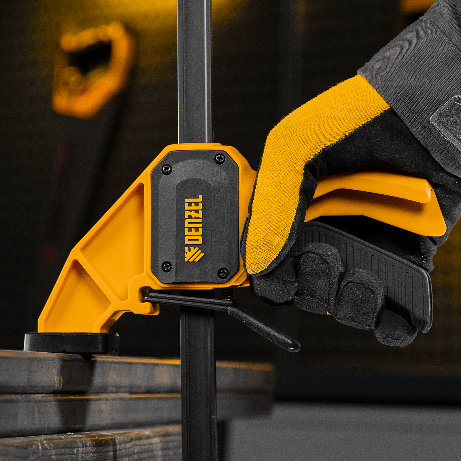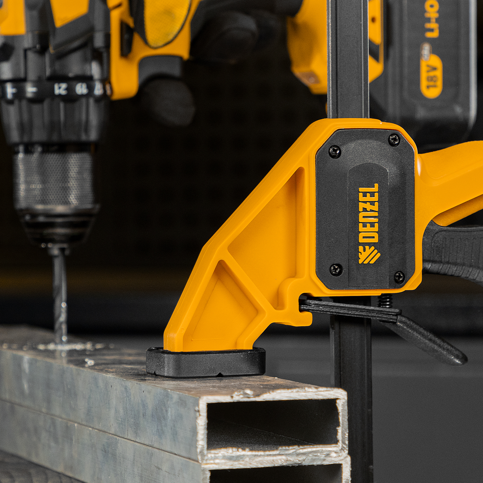 - Комфортное использование — струбцина весит всего 764 г, обрезиненная кнопка фиксации обеспечивает удобный захват.