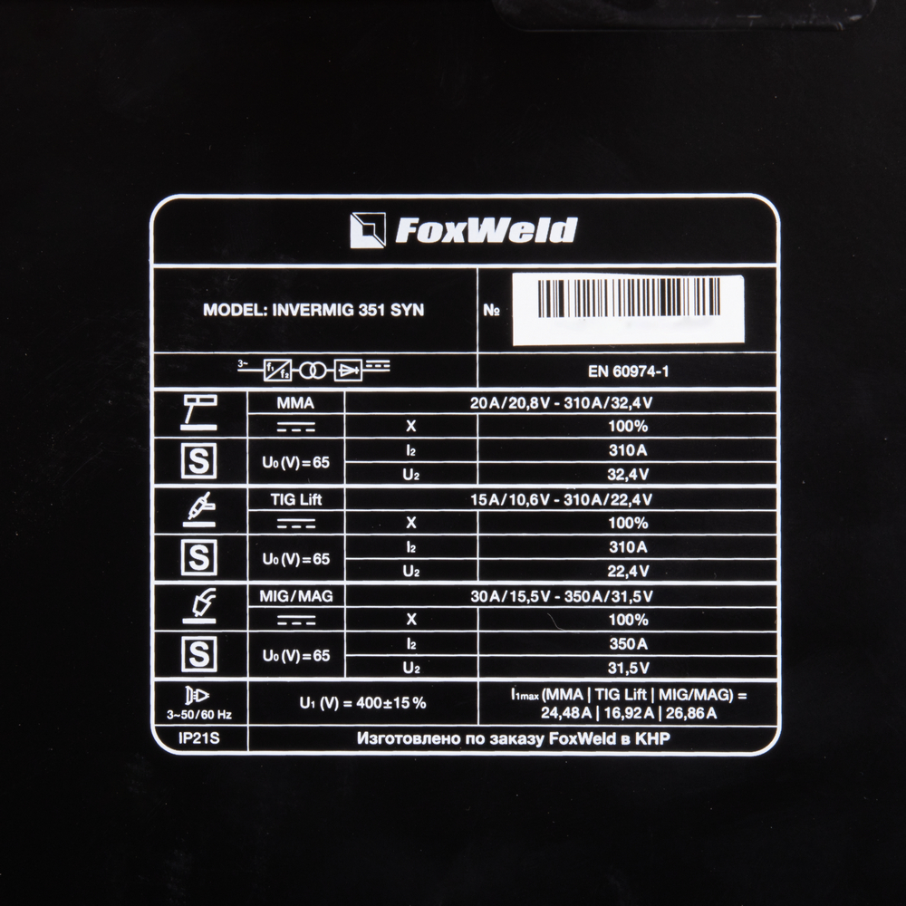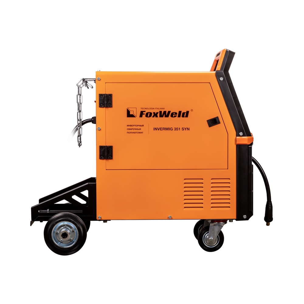 FOXWELD INVERMIG 351 SYN — промышленный многофункциональный трёхфазный синергетический инвертор, позволяющий производить сварку изделий из низкоуглеродистой и легированной стали и алюминия. Аппарат выполнен в едином корпусе со встроенным мощным 4-роликовым механизмом подачи проволоки, рассчитанным для использования катушек D200 (5кг) и D300 (15 кг). 2 цифровых дисплея на панели управления, мощная ручка на корпусе, платформа на колёсах для перемещения с местом для установки баллона с газом – в аппарате есть всё для проведения сварочных работ в сервисных металлоцентрах и при монтаже различных металлоконструкций.РАБОТА БЕЗ ОСТАНОВКИ: ПВ 100% на максимальном токе при КПД 85% обеспечивает бесперебойную устойчивую работу на протяжении всего трудового дня. На задней панели расположена розетка 36 В для подключения подогревателя газа, который необходим для защиты обледенения редуктора во время продолжительной работы.МНОГОФУНКЦИОНАЛЬНОСТЬ 3-В-1: Благодаря своей многофункциональности, аппарат позволяет проводить следующие процессы сварки: полуавтоматическую сварку сплошной проволокой в среде защитных газов с ручным режимом настройки параметров сварки, с синергетическим управлением параметрами сварки (MIG/MAG), полуавтоматическую сварку самозащитной проволокой без использования защитного газа, ручную дуговую сварку штучным электродом с покрытием (ММА), аргонодуговую сварку на постоянном токе с возбуждением дуги касанием вольфрамового электрода (TIG LIFT).СИНЕРГЕТИЧЕСКИЙ РЕЖИМ УПРАВЛЕНИЯ: Полностью синергетическое управление "одной кнопкой". Режим синергетики позволяет сэкономить время и получить качественное сварное соединение даже новичку, так как основные сварочные параметры подбираются автоматически. С помощью синергетического режима управления можно легко и быстро настроить аппарат под любую задачу. Преимущества синергетики: простота в настройке даже неквалифицированным персоналом, быстрая установка сварочных параметров, высокая производительность, гарантированное получение качественного сварного соединения. Синергетику можно отключить для работы в ручном режиме.4-РОЛИКОВЫЙ МЕХАНИЗМ ПОДАЧИ: 4-роликовый механизм подачи с 4-мя ведущими роликами подаёт проволоку в область сварки без проскальзывания и рывков при использовании длинных сварочных горелок, что обеспечивает меньшее давление и деформацию сварочной проволоки. Механизм подачи с 4-мя ведущими роликами отлично подходит для сварочной порошковой проволоки, проволоки, сделанной из алюминия, и даёт дополнительные преимущества при производстве и в монтажных условиях. Подача проволоки осуществляется с высокой точностью и надёжностью, что влияет на производительность, качество сварочного шва и время использования сварочного аппарата.ФУНКЦИЯ VRD: Функция VRD (снижение напряжения холостого хода) повышает безопасность и исключает риск поражения сварщика электрическим током. Сварочный процесс становится более безопасным в замкнутых пространствах и при сварке в условиях повышенной влажности.ПРЕИМУЩЕСТВА:Синергетический режим управленияАргонодуговая сварка (TIG LIFT) на постоянном токеСварка без газа самозащитной проволокойСинергетический режим управленияРежим работы горелки 2Т / 4Т / Special 4TФункции Hot Start (Горячий Старт), AntiSticking (Антизалипание) и Arc Force (Форсаж Дуги)Функция VRD (сниж