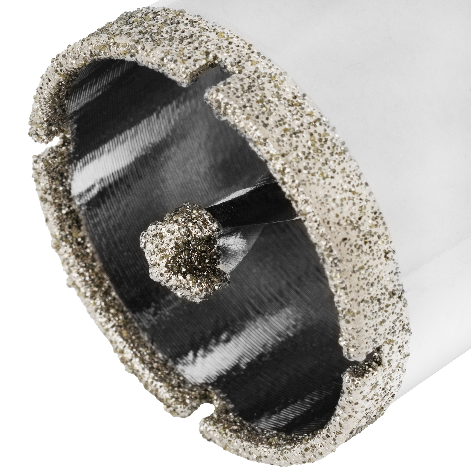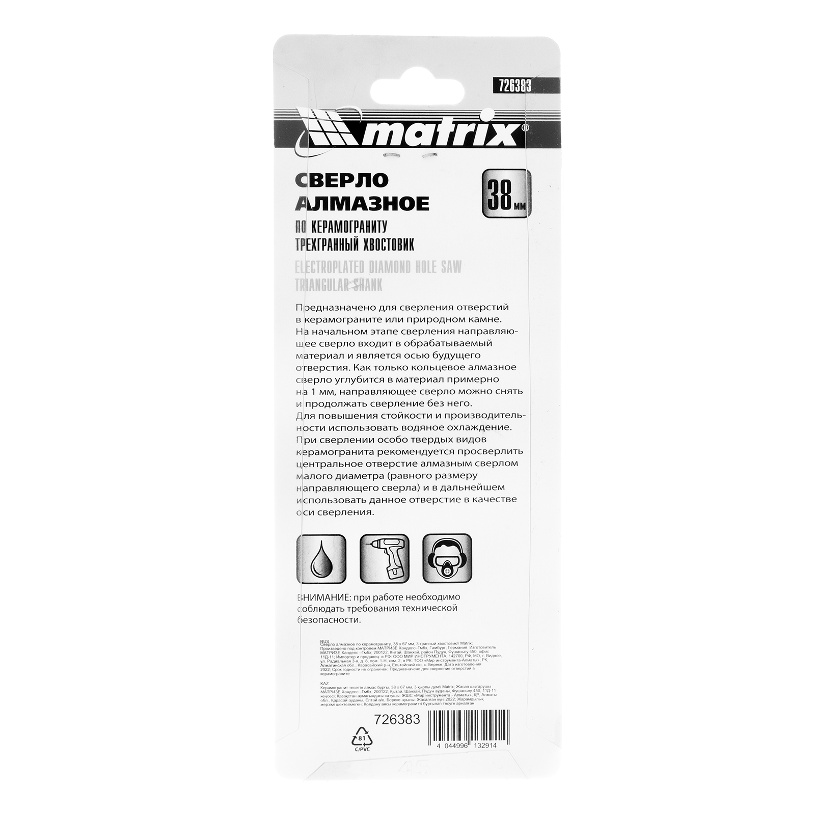 Универсальное алмазное сверло по керамограниту Matrix 726383 размером 38 х 67 мм, с 3-гранным хвостовиком, применяется для получения отверстий в стекле, плитке, кафеле. За счет высокой концентрации алмазов в режущем слое оно легко справляется со сверлением керамогранита. Сверло рассчитано на профессиональное использование с дрелями и шуруповертами. Водяное охлаждение в процессе работы значительно повышает срок службы оснастки.