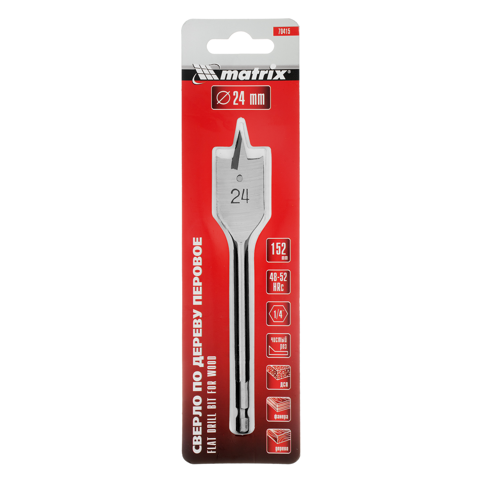 Перовое сверло по дереву Matrix 70415 диаметром 24 мм, с 6-гранным хвостовиком, имеет рабочую часть в виде «лопатки» с режущими кромками по бокам, поэтому эффективно для сверления глубоких сквозных и глухих отверстий. Оснастка устанавливается на ручную механическую или электрическую дрель, сверлильный станок, с ее помощью можно сверлить древесину любых пород.