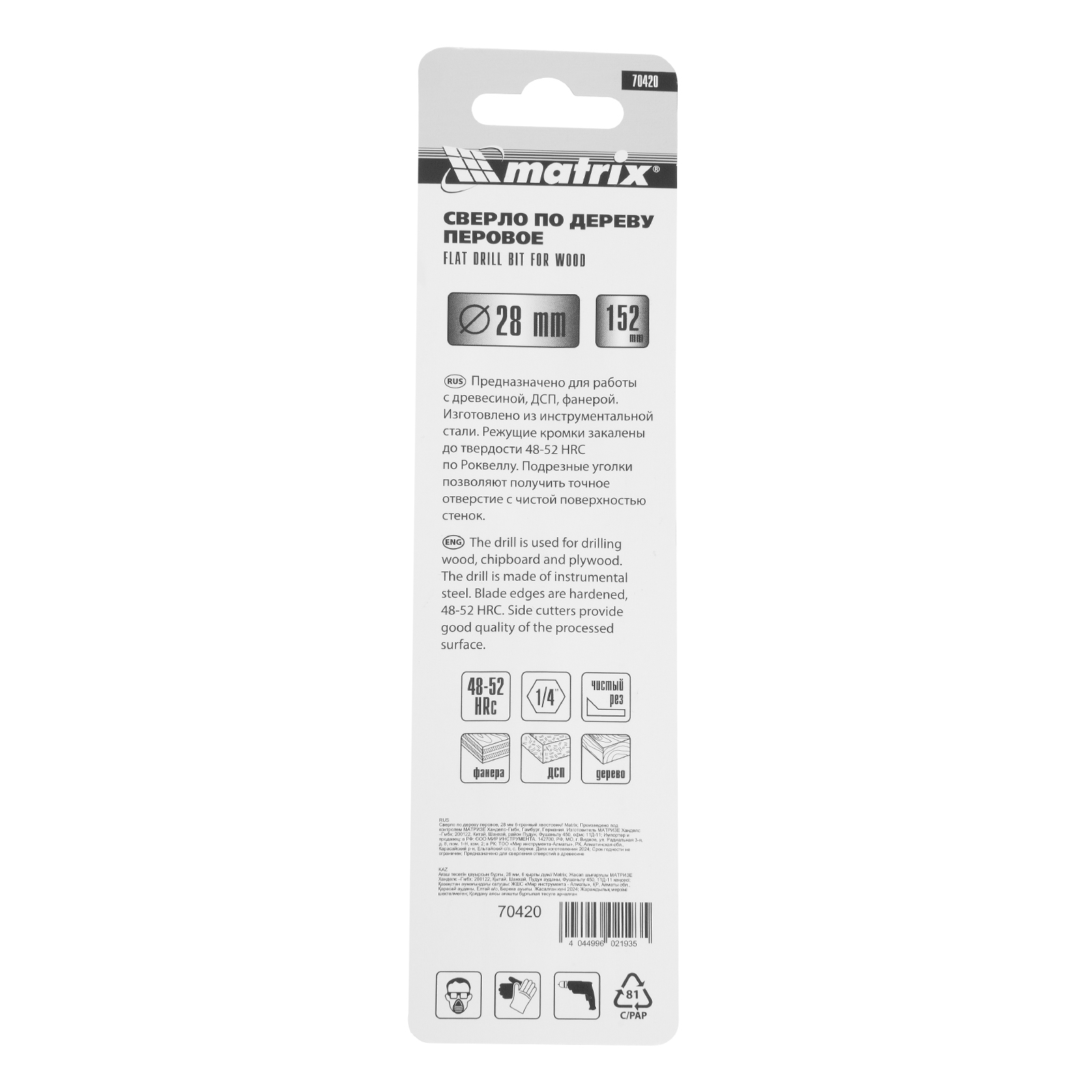 Перовое сверло по дереву Matrix 70420 диаметром 28 мм, с 6-гранным хвостовиком, имеет рабочую часть в виде «лопатки» с режущими кромками по бокам, поэтому эффективно для сверления глубоких сквозных и глухих отверстий. Оснастка устанавливается на ручную механическую или электрическую дрель, сверлильный станок, с ее помощью можно сверлить древесину любых пород.