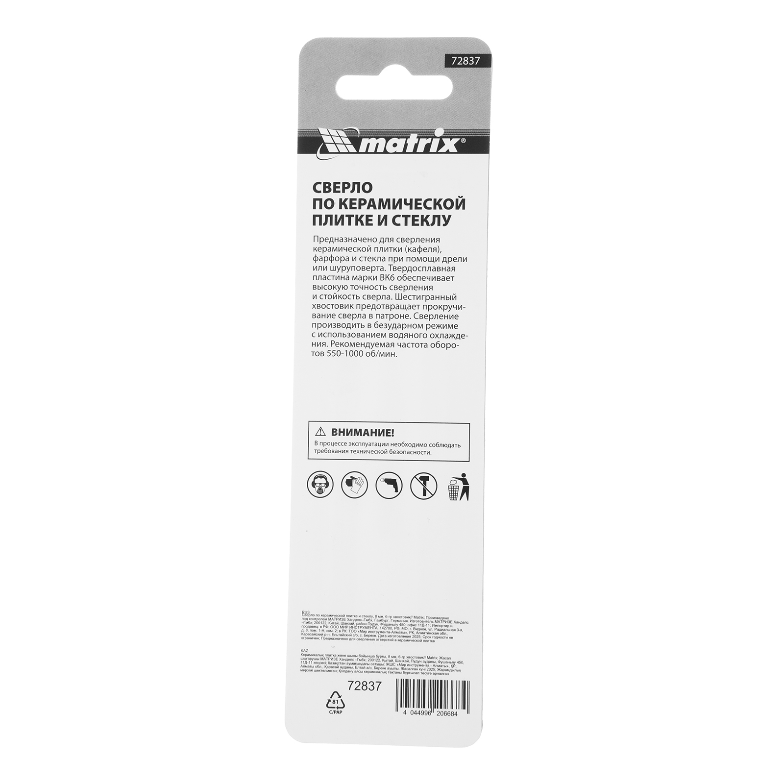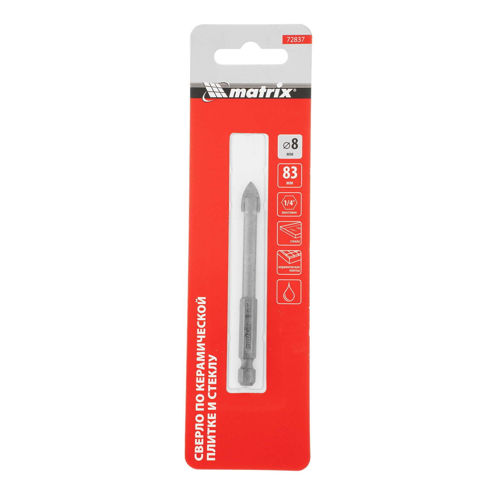 Сверло Matrix 72837 диаметром 8 мм, с шестигранным хвостовиком, используется для сверления керамической плитки, стекла и других материалов с помощью дрели или шуруповерта. Выдерживает высокие нагрузки и подходит для интенсивного использования.