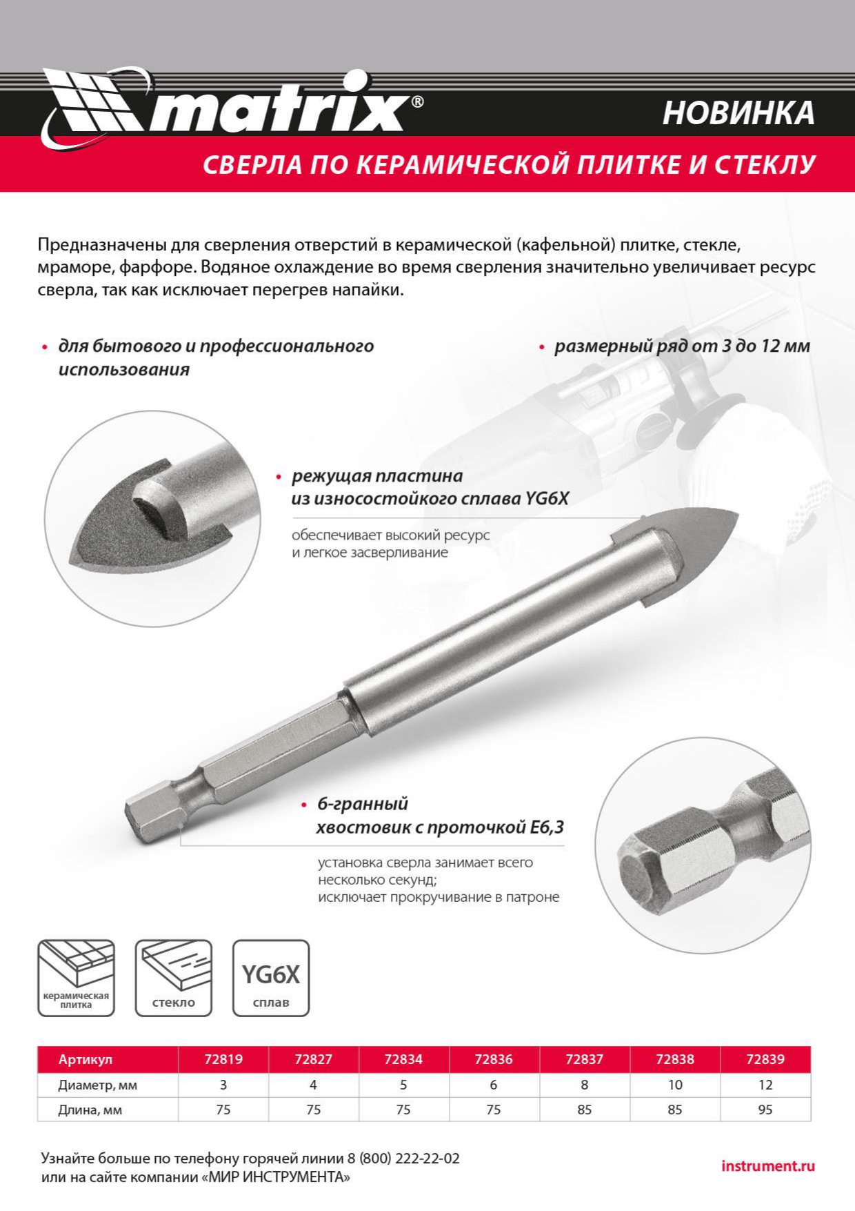 Сверло по керамической плитке и стеклу, 8 мм, шестигранный хвостовик Matrix