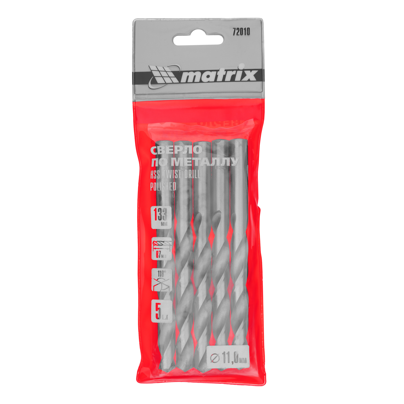 Полированное сверло по металлу Matrix 72010 из стали HSS, с цилиндрическим хвостовиком, 5 шт. в упаковке, используется для получения отверстий диаметром 11 мм. Угол заточки составляет 118 градусов, поэтому сверло оптимально для работы с черными металлами, сталью, чугуном и твердой бронзой.