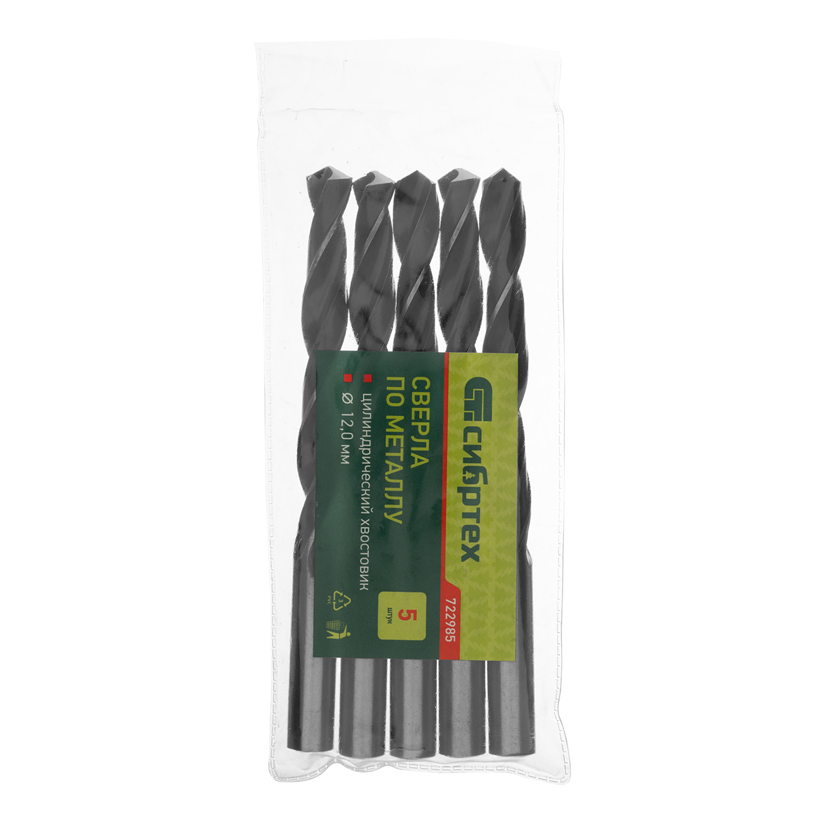 Сверло по металлу Сибртех 722985 из быстрорежущей стали, с цилиндрическим хвостовиком, 5 шт. в упаковке, имеет угол заточки 118° и используется для получения отверстий диаметром 12 мм в цветных и тяжелых металлах. Инструмент применяется в профессиональных и бытовых целях.
