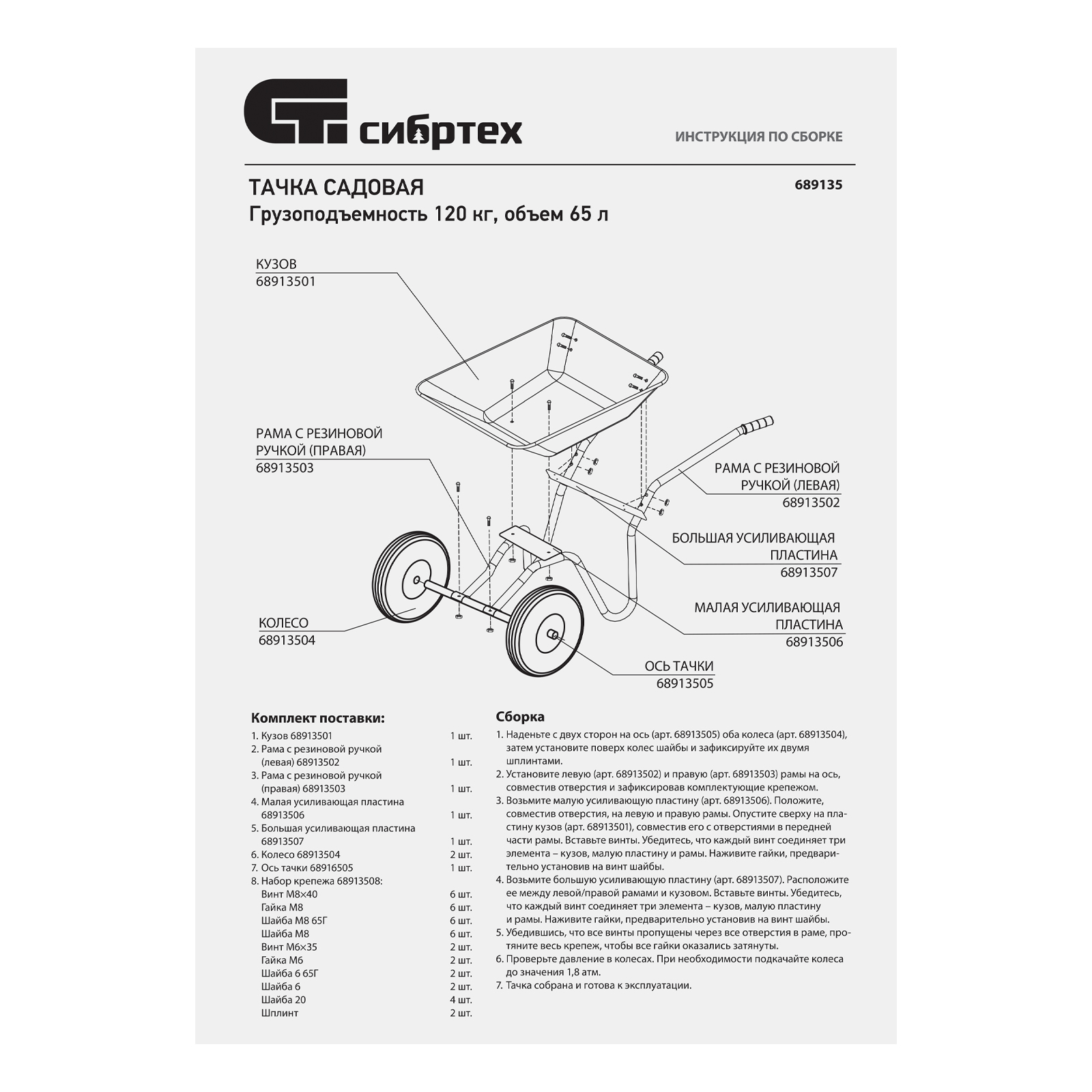 Тачка садовая, 2-х колесная, грузоподъемность 120 кг, объем 65 л Сибртех в Санкт-Петербурге