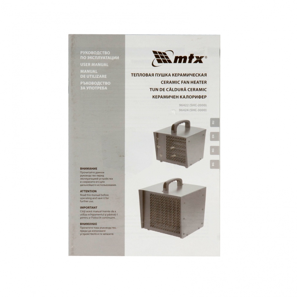 Керамическая тепловая пушка MTX SHC-2000 96422 производительностью 120 куб. м/ч, квадратная, рассчитана на обогрев помещений площадью до 20 кв.м. на мощности 1 или 2 кВт. Работает в режиме теплый воздух / горячий воздух, подходит для использования в гараже, теплице, на складе, в погребе, подвале или ангаре. Также поможет ускорить процесс ремонта в сырую и холодную погоду, ведь ее можно использовать для просушки поверхностей, например, оштукатуренных и окрашенных стен.,В пушке используется керамический нагревательный элемент — он отличается от открытых спиралей нагрева меньшей рабочей температурой и большей площадью, поэтому не сжигает мелкие частицы пыли, не выделяет вредных веществ и не сушит воздух.