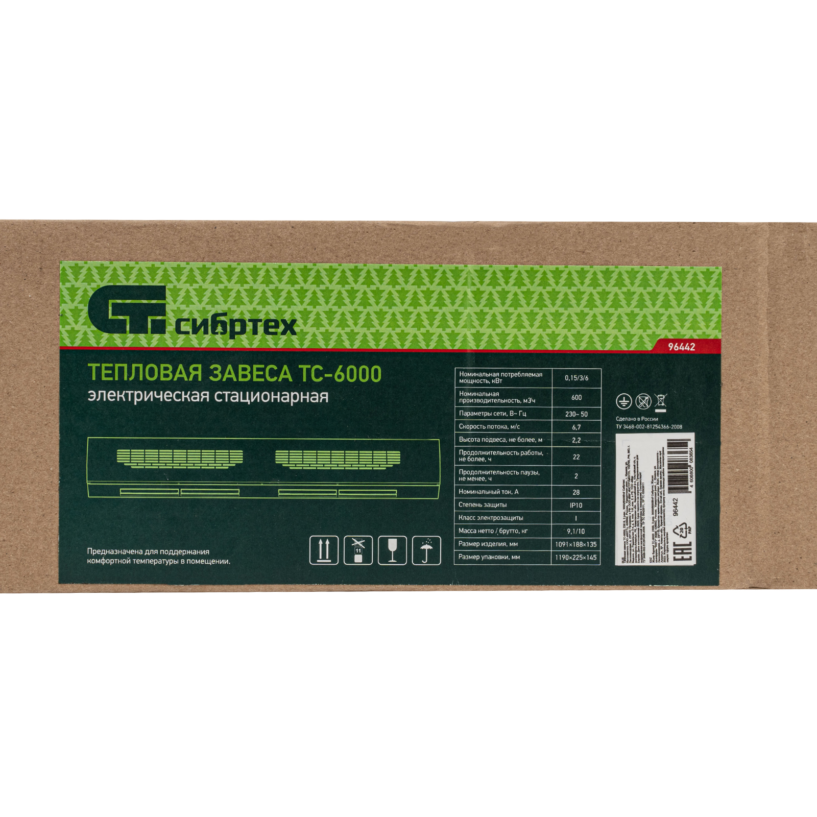 Электрическая тепловая завеса (тепловентилятор) Сибртех ТС-6000 96442 работает в 3 режимах: обдув без нагрева, обогрев на мощности 3000 и 6000 Вт. Создает узконаправленный воздушный поток, позволяющий разделить различные климатические зоны, например, отделить воздух в помещении от воздуха снаружи. Устанавливается над оконными или дверными проемами, расход воздуха составляет 600 м3/ч. Питается от сети 220 В, поэтому подходит для домашнего применения. Игольчатый нагревательный элемент (ститч) обеспечивает быстрый разогрев до заданной температуры. Рекомендуемая площадь обогрева составляет 60 м2.