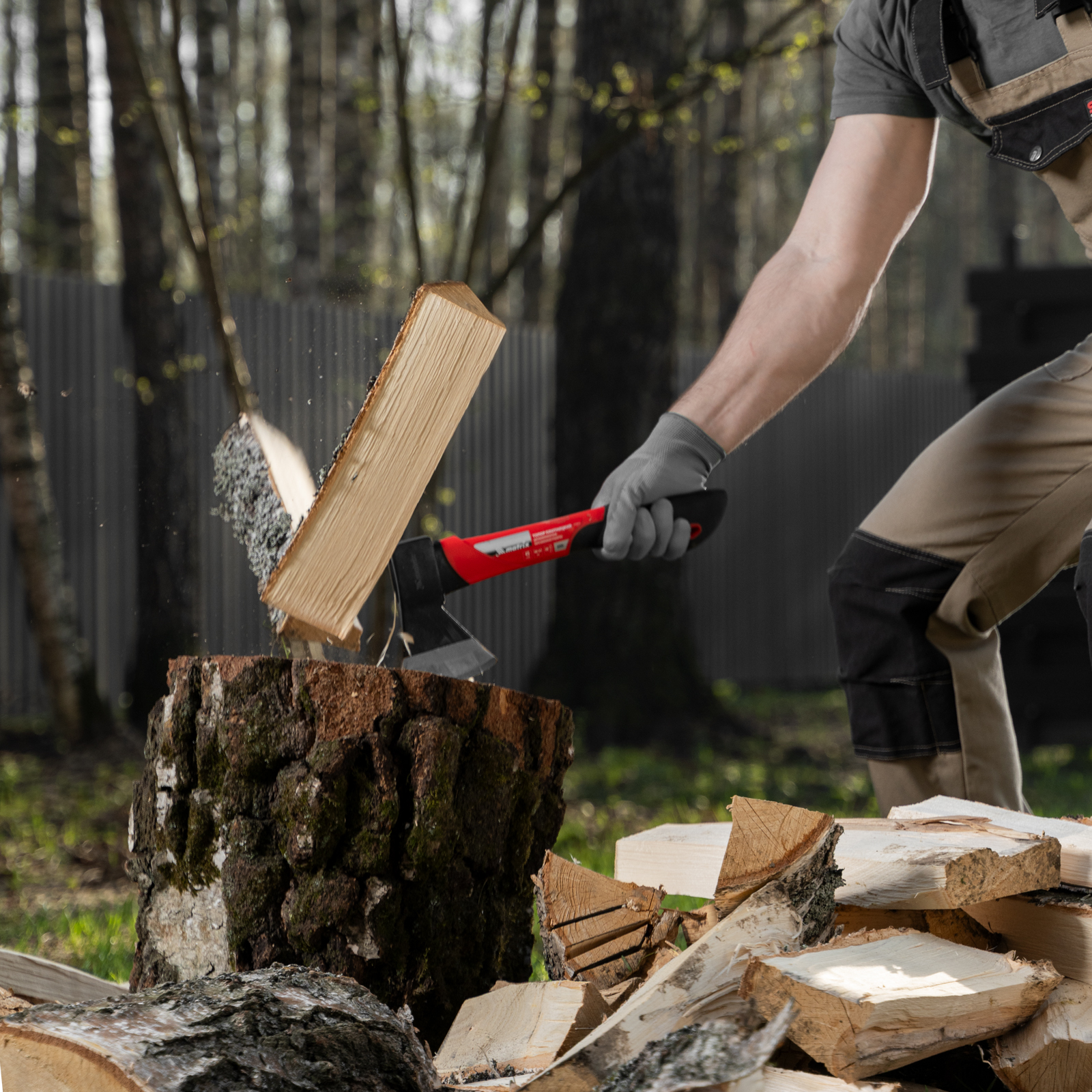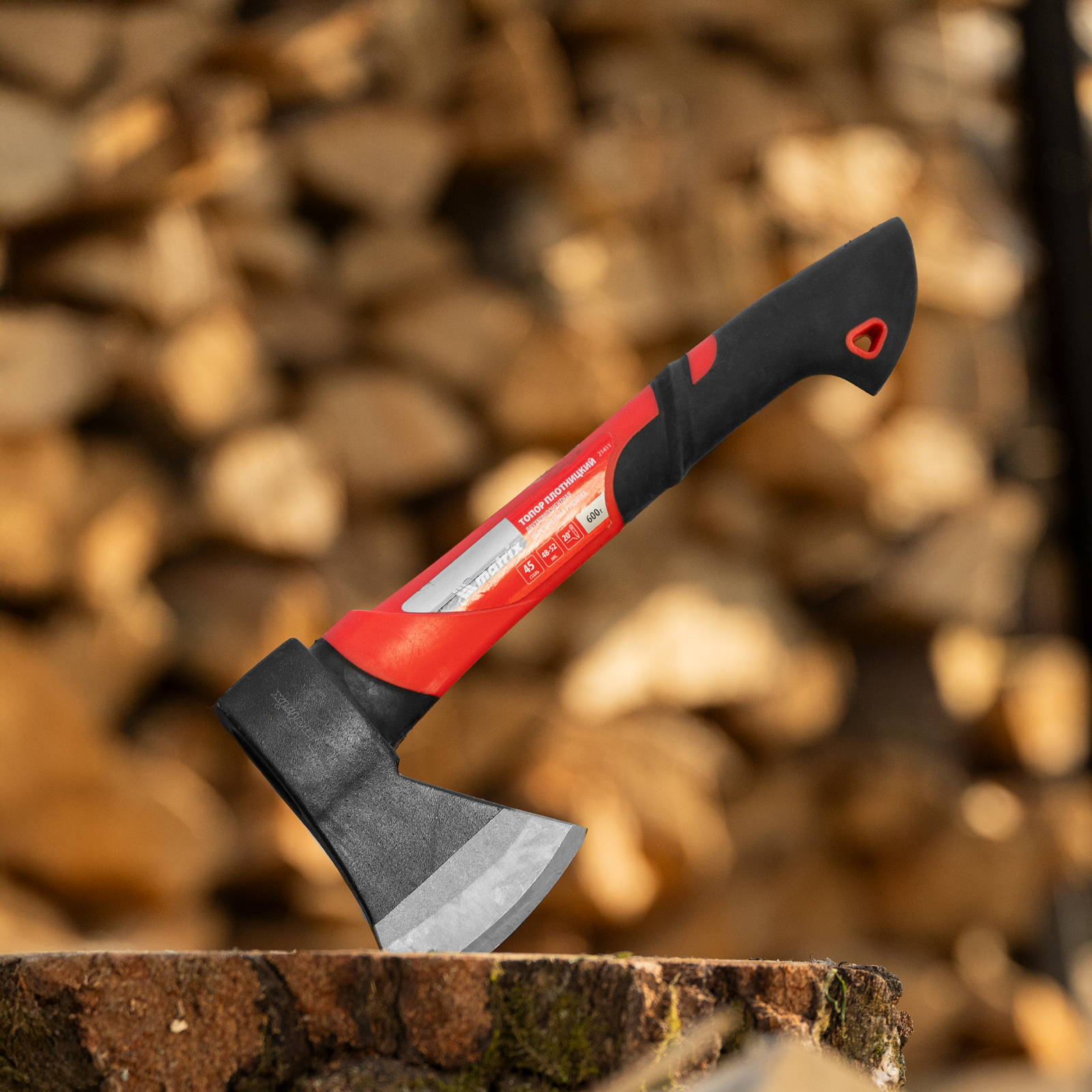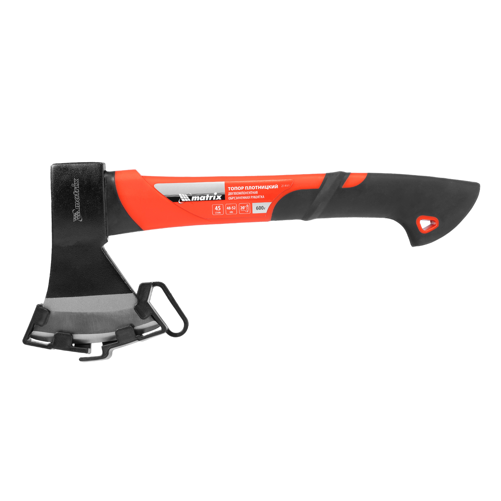- Безопасное хранение и транспортировка — топор поставляется с защитной пластиковой накладкой на лезвии.