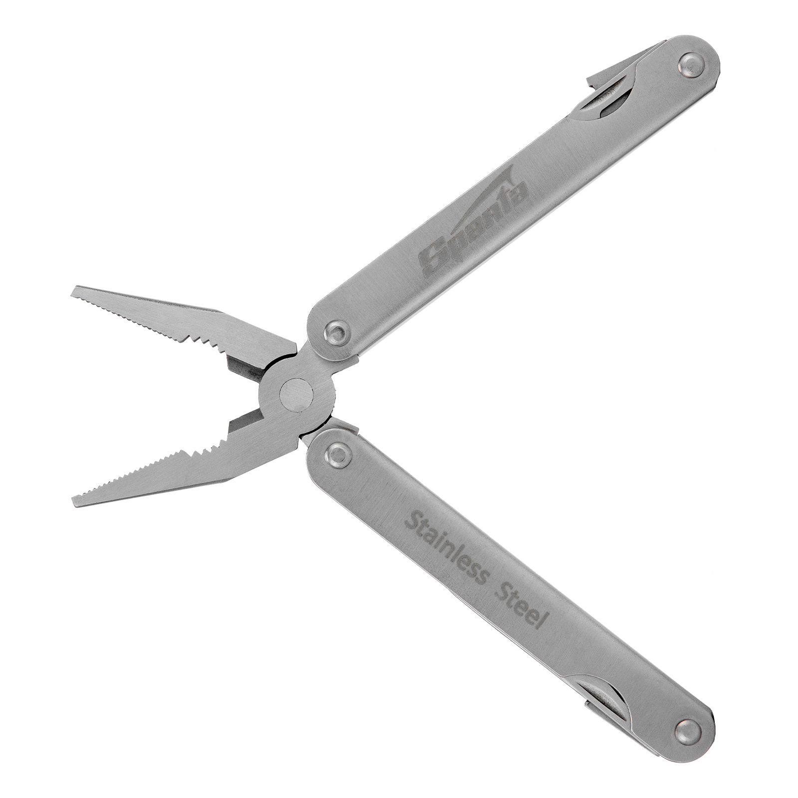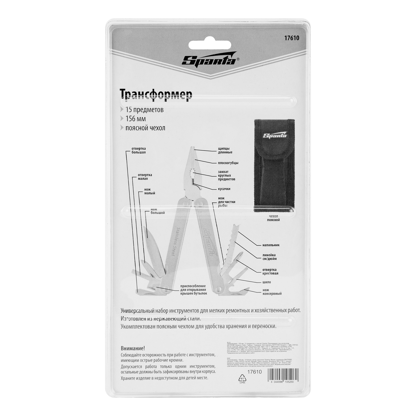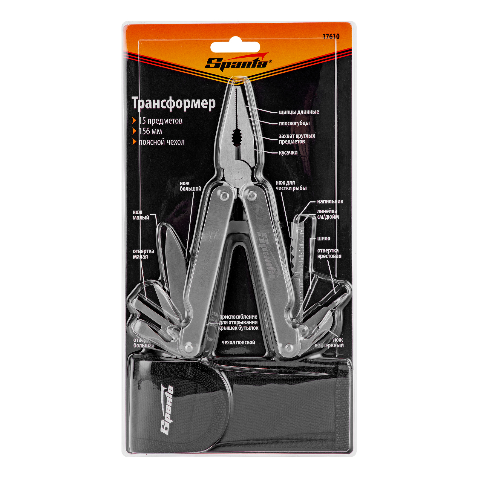 Трансформер Sparta 17610 с 15 функциями в рабочем положении имеет длину 156 мм, поставляется в чехле. Подходит для выполнения множества мелких работ: разрезания различных материалов, закручивания и откручивания крепежей, чистки рыбы, захвата или опиливания деталей, перекусывания проволоки, открывания бутылок и консервных банок. Многофункциональный инструмент пригодится на даче, в гараже, поездке, походе, на охоте или рыбалке.