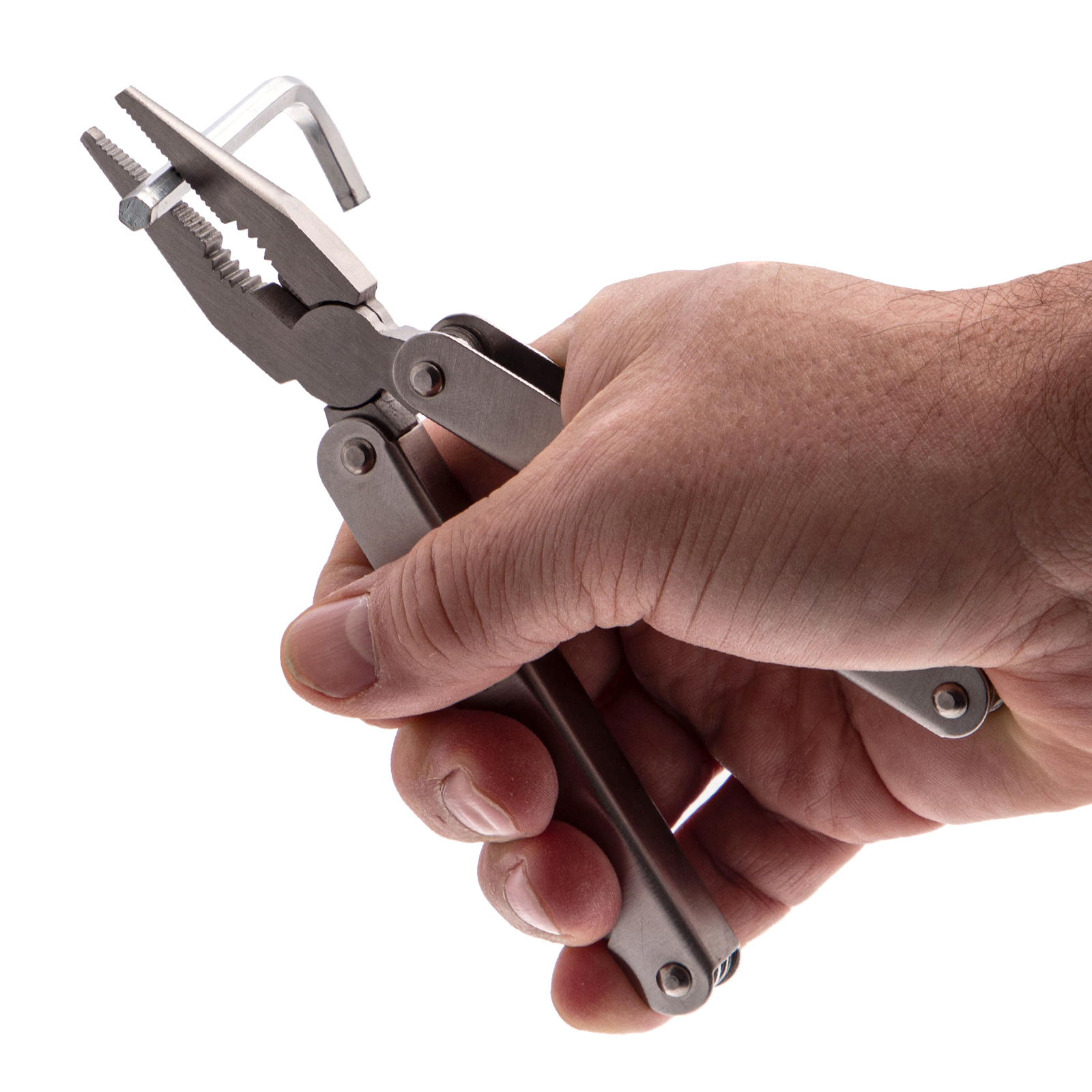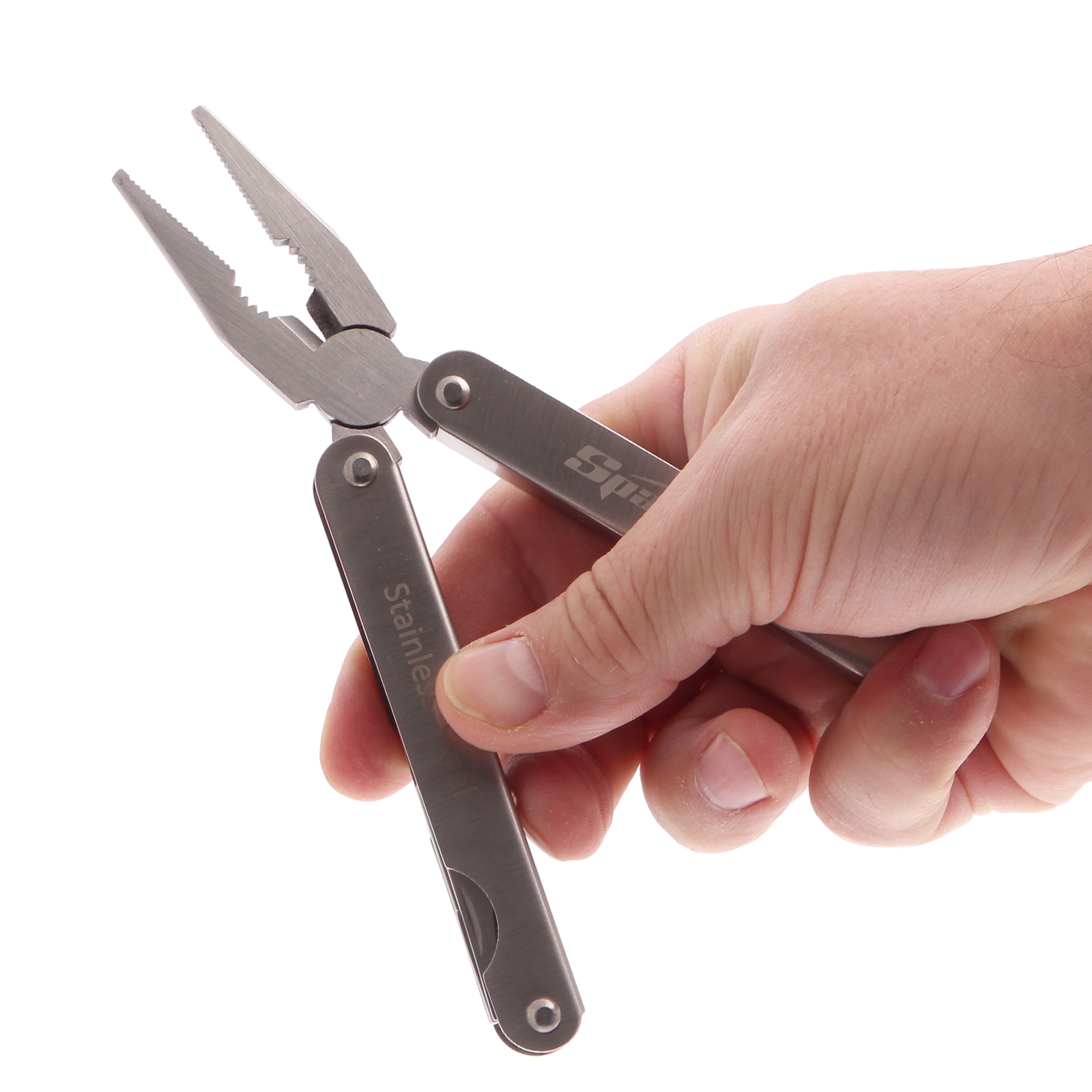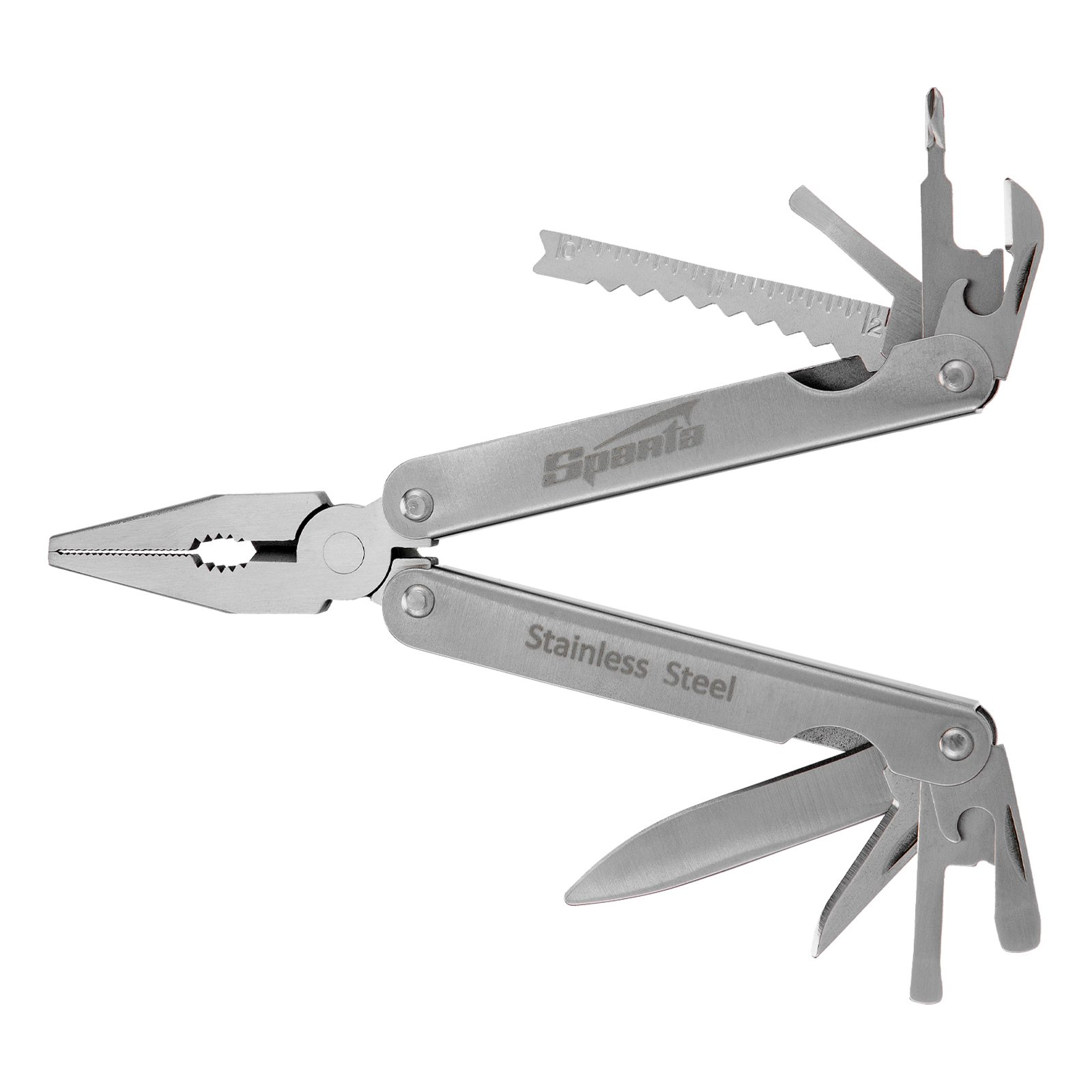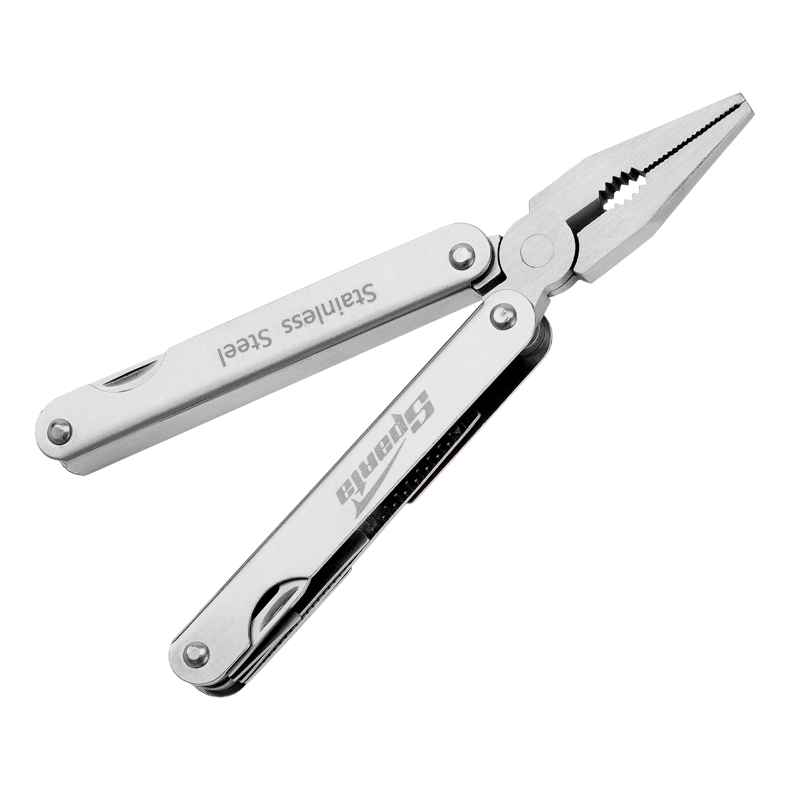 Трансформер Sparta 17610 с 15 функциями в рабочем положении имеет длину 156 мм, поставляется в чехле. Подходит для выполнения множества мелких работ: разрезания различных материалов, закручивания и откручивания крепежей, чистки рыбы, захвата или опиливания деталей, перекусывания проволоки, открывания бутылок и консервных банок. Многофункциональный инструмент пригодится на даче, в гараже, поездке, походе, на охоте или рыбалке.