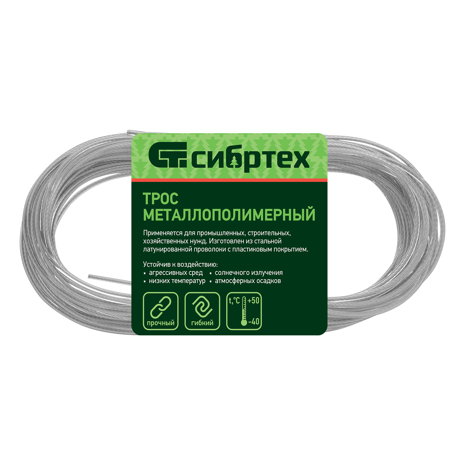 Металлополимерный прозрачный трос ПР-2.5 Сибртех 47627 толщиной 2,5 мм, 20 м. п. в мотке, можно использовать в домашнем хозяйстве для развешивания белья или на загородном участке в качестве садового шнура для подвязки растений. Применяется также для крепления погружных насосов и датчиков, монтажа тентовых конструкций, информационных табличек и растяжек, установки ограждений, антенн и мачт. Трос устойчив к перепадам температуры и воздействиям агрессивных сред, поэтому может использоваться в сложных условиях.