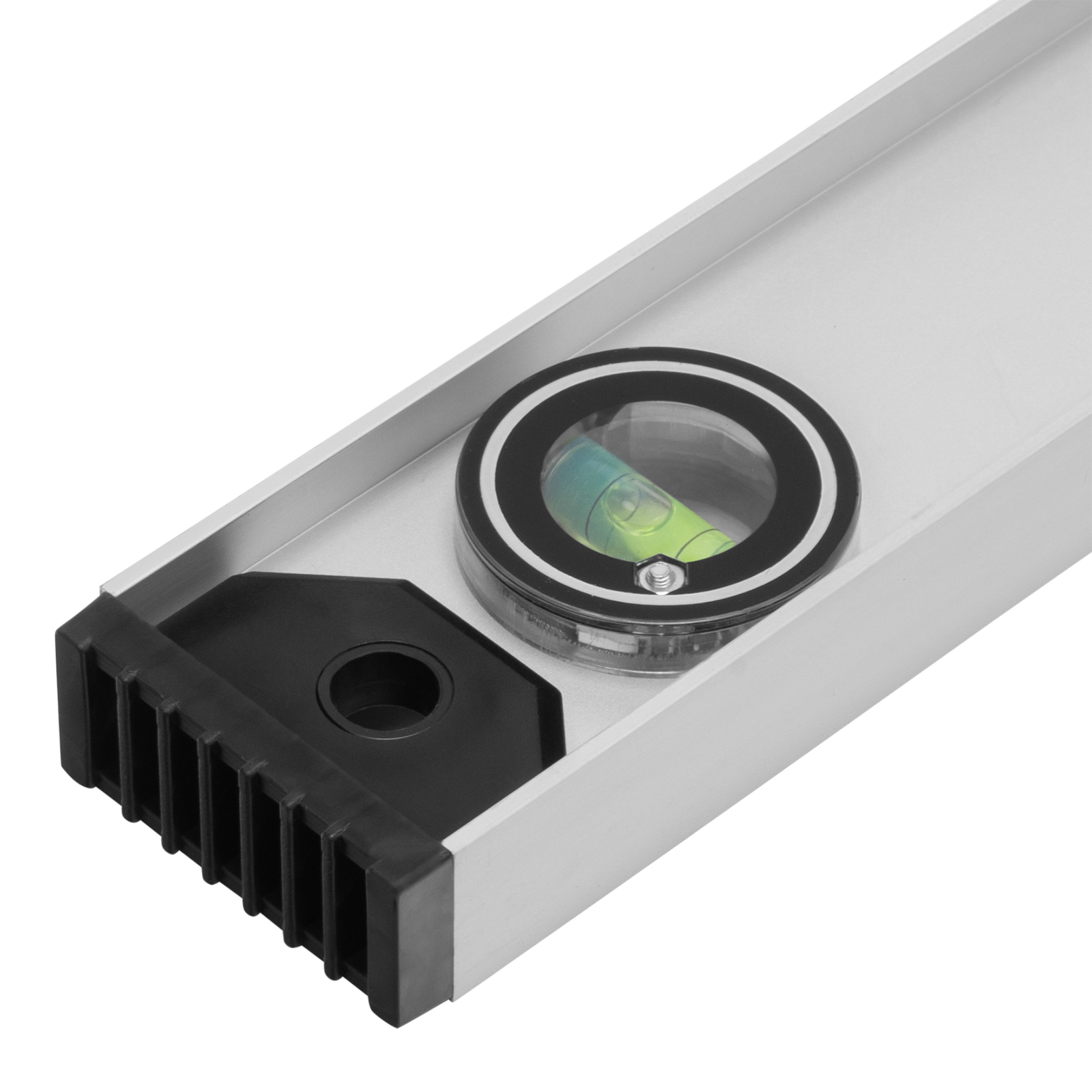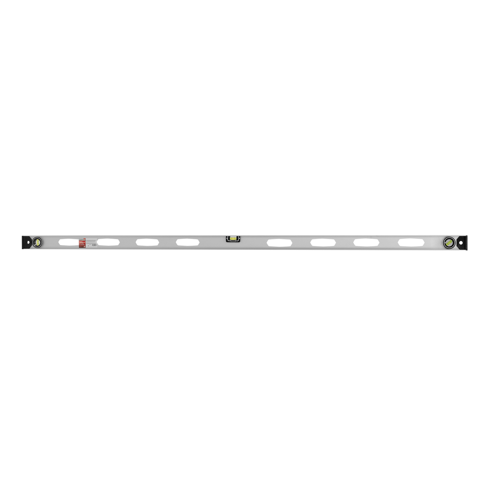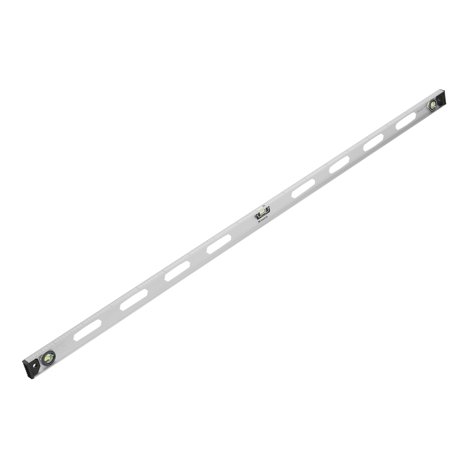Алюминиевый уровень Matrix «Рельс» 34038 длиной 1800 мм имеет 3 глазка: 2 для проверки отклонений от заданной вертикали и горизонтали и 1 поворотный для проверки наклонных поверхностей.