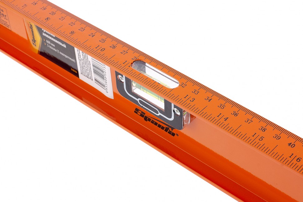 Уровень алюминиевый Sparta «Рельс» 34046 длиной 600 мм имеет 3 глазка, 1 из которых поворотный. С помощью инструмента удобно определять наличие отклонений от горизонтали и вертикали, а также выставлять произвольный угол.