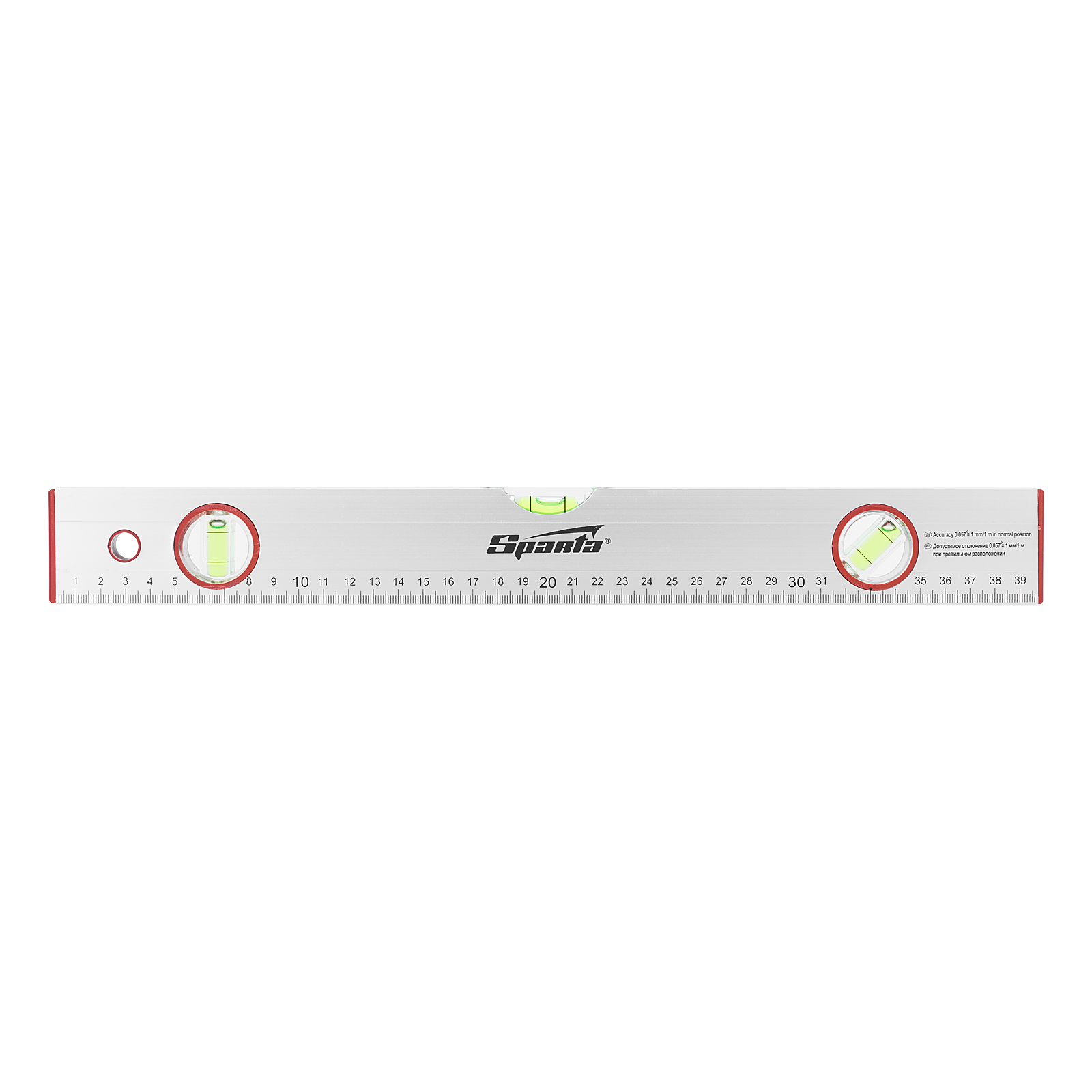 Алюминиевый уровень Sparta 331205 длиной 400 мм, с 3 глазками и линейкой, используется на строительной площадке и во время ремонта. Повышает точность выполнения облицовочных, отделочных и других работ, позволяя проверить отклонения по горизонтали и вертикали, измерить угол наклона, выровнять поверхности и предметы.